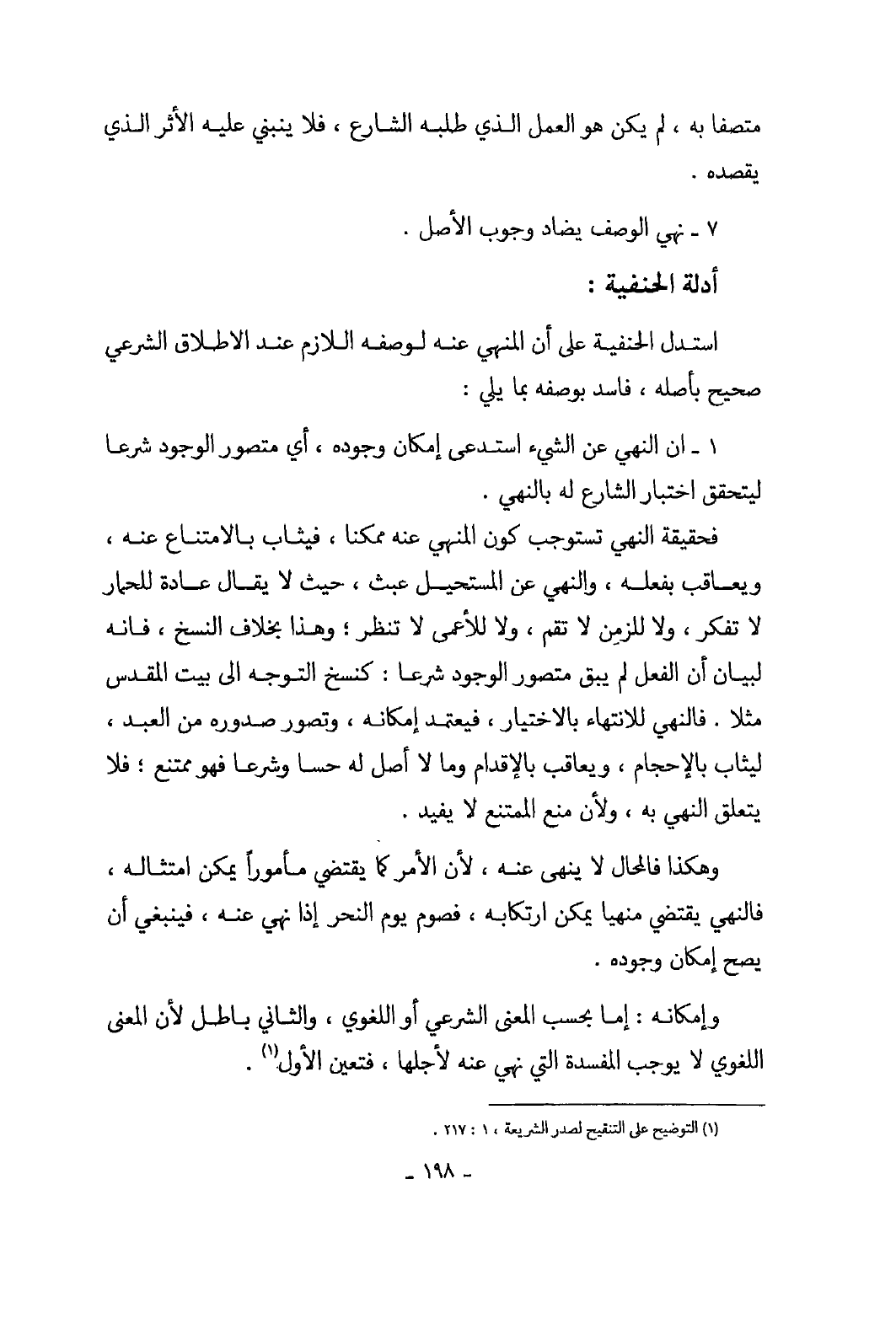 قُلْنَا وَكَذَلِكَ إِذا بَاعَ بِخَمْر أَو ميتَة وَنَحْو ذَلِك أَو اشْترى بِهِ أضيف فِيهِ البيع إِلَى غير مَحَله وَقد سلك الْبَزْدَوِيّ وَغَيره من أئمتهم فِي هَذَا الْموضع طَرِيقا عجبا وَهُوَ انهم قَالُوا بِصِحَّة طواف الْحَائِض مَعَ التَّحْرِيم دون صلاه الْمُحدث ففرقوا بَينهمَا بَان طواف الْمُحدث ورد فِيهِ مُجَرّد النَّهْي وَهُوَ يَقْتَضِي الصِّحَّة على أصلهم بِخِلَاف الصَّلَاة فَإِنَّهُ ورد فِيهَا النَّفْي مثل (لَا صَلَاة إِلَّا بِوضُوء) وَالنَّفْي يَقْتَضِي الْعَدَم فَيكون بَاطِلا