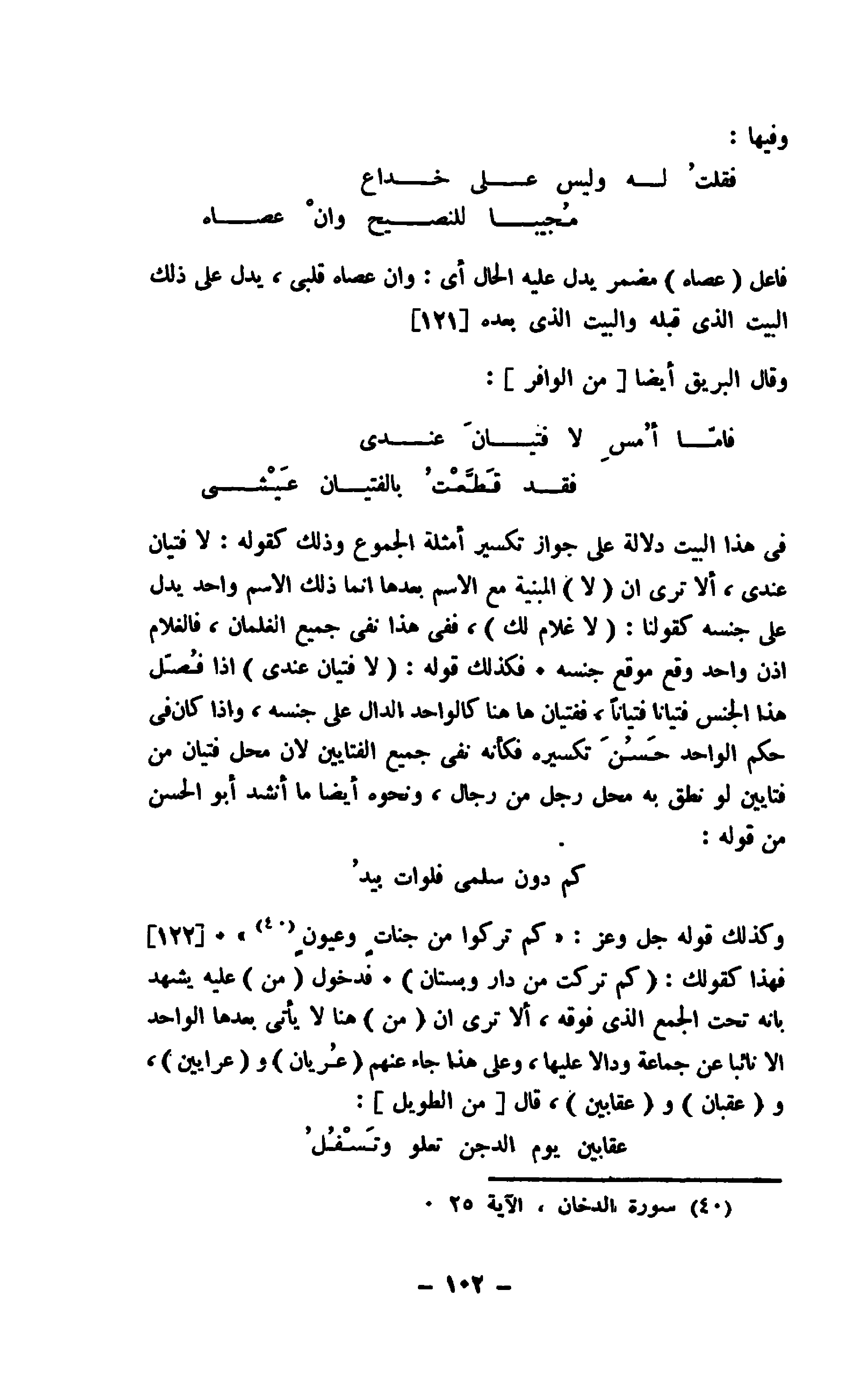 وكذلك قوله جل وعز: (كم تروا من جناتٍ وعيونٍ) فهذا كقولك: " كم تركت من دار وبستان ". فدخول " من " عليه يشهد بأنه تحت الجمع الذي فوقه، ألا ترى إن " من " هنا لا يأتي بعدها الواحد إلا نائبا عن جماعة ودالا عليها، وعلى هذا جاء عنهم " عُريان " و " عرايين "، و " عقبان " و " عقابين "، قال " من الطويل ":