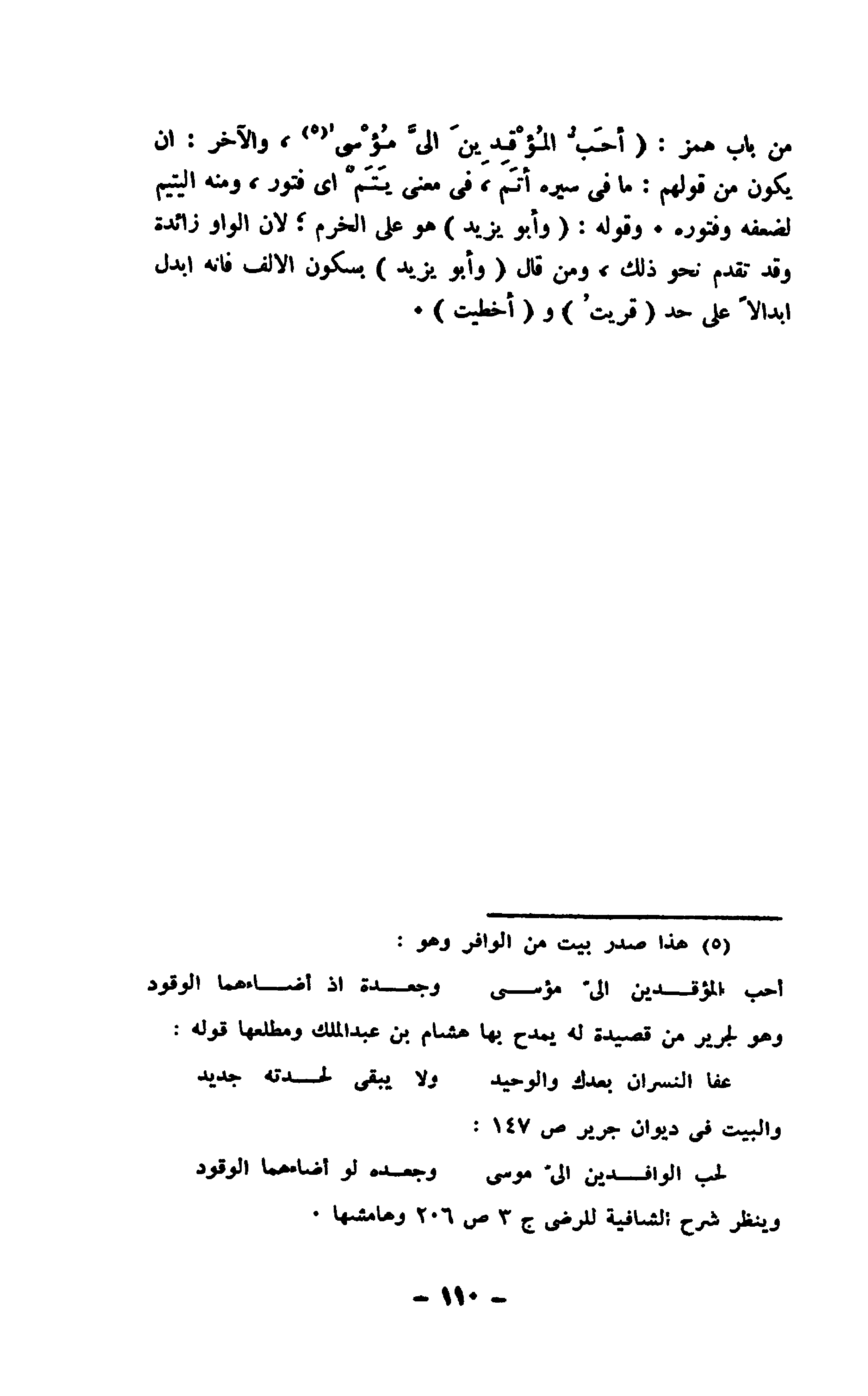 من باب همز: " أحَبُّ المُؤْقِدِينَ إليَّ مُؤْسي، والآخر: إن يكون من قولهم: ما في سيره أتَم، في معنى يَتَمٌ أي فتور، ومنه اليتيم لضعفه وفتوره. وقوله: " وأبو يزيد " هو على الخرم؛ لأن الواو زائدة وقد تقدم نحو ذلك، ومن قال " وأبو يزيد " بسكون الألف فأنه أبدل إبدالا على حد " قريتُ " و " أخطيت ".