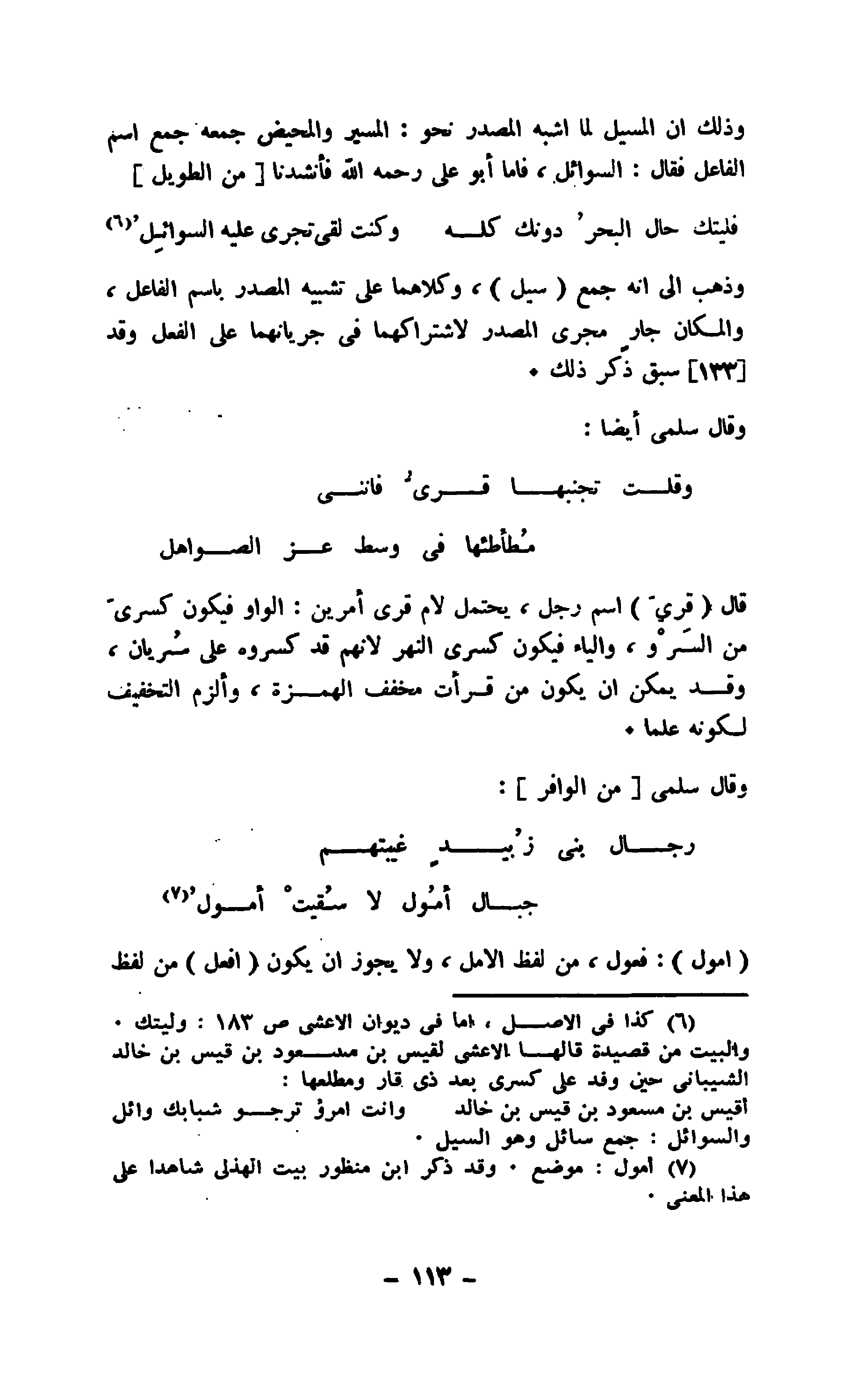 وذلك إن المسيل لما أشبه المصدر نحو: المسير والمحيض جمعه جمع اسم الفاعل فقال: السوائل، فأما أبو علي رحمه الله فأنشدنا " من الطويل "