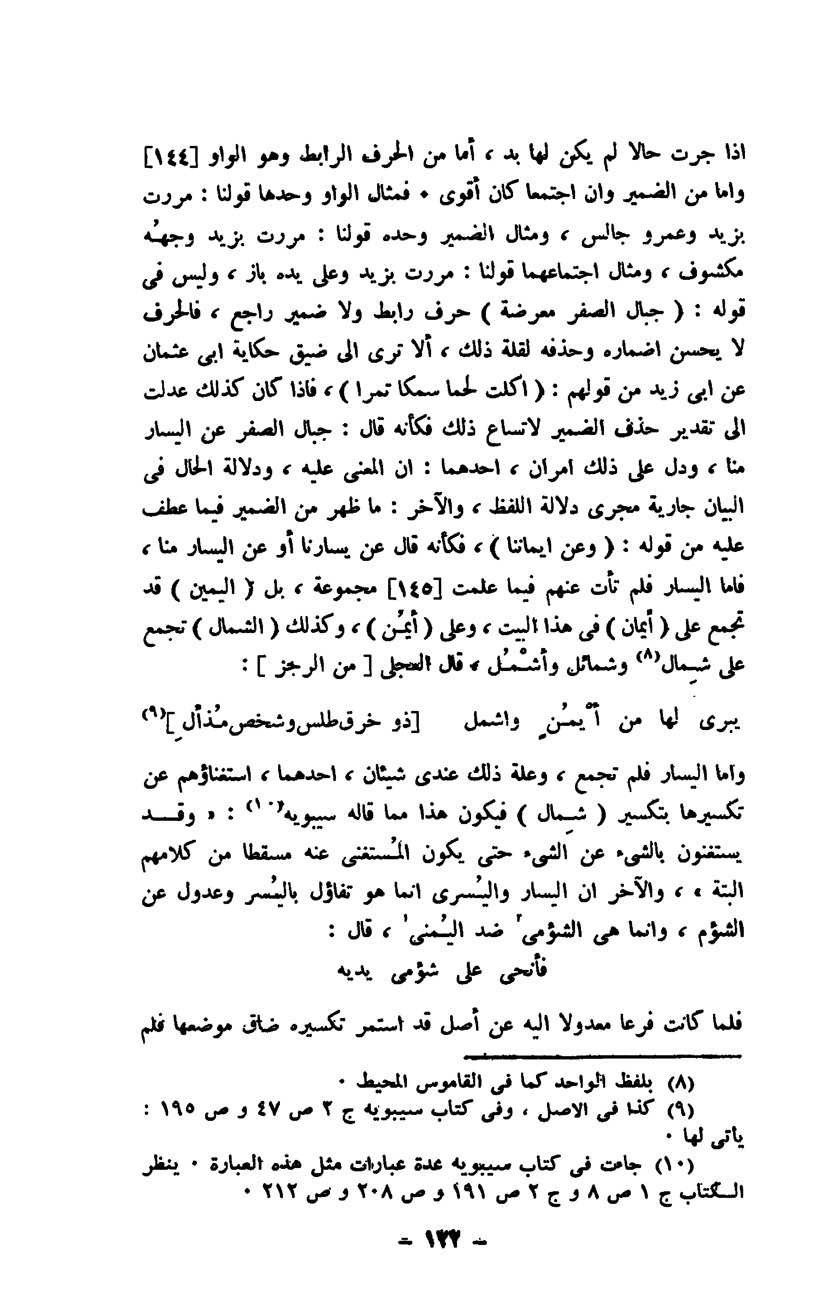 وأما اليسار فلم تجمع، وعلة ذلك عندي شيئان، أحدهما، استغناؤهم عن تكسيرها بتكسير " شمال " فيكون هذا مما قاله سيبويه: " وقد يستغنون بالسيئ عن الشيء حتى يكون المُستغنى عنه مسقطا من كلامهم البتة "، والآخر أن اليسار واليُسرى إنما هو تفاؤل باليُسر وعدول عن الشؤم، وإنما هي الشؤمى ضد اليُمنى، قال: