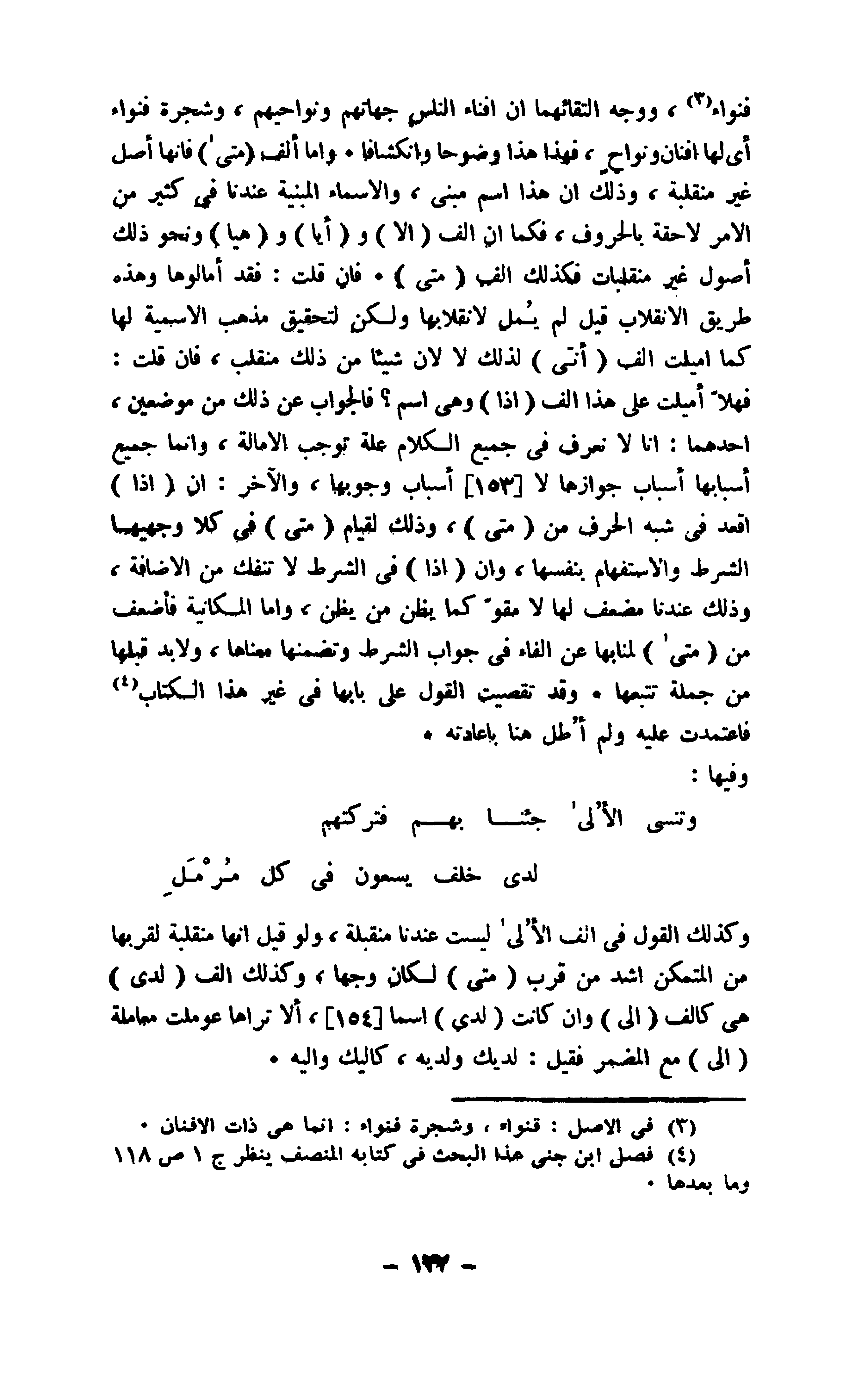 فنواء، ووجه التقائهما أن أفناء الناس جهاتهم ونواحيهم، وشجرة فنواء أي لها أفنان ونواح، فهذا وضوحا وانكشافا. وأما ألف " متى " فإنها أصل غير منقلبة، وذلك أن هذا اسم مبني، والأسماء المينية عندنا في كثير من الأمر لاحفة بالحروف، فكما أن ألف " إلا " و " أيا " و " هيا " ونحو ذلك أصول غير متقلبات فكذلك ألف " متى ". فأن قلت: فقد أمالوها وهذه طريق الانقلاب قيل لم يُمل لانقلابها ولكن لتحقيق مذهب الاسمية لها كما أمليت ألف " أنّي " لذلك لا لأن شيئا من ذلك منقلب، فأن قلت: فهلاً أميلت على هذا ألف " إذا " وهي اسم؟ فالجواب عن ذلك من موضعين، أحدهما: أنا لا نعرف في جميع الكلام علة توجب الإمالة، وإنما جميع أسبابها أسباب جوازها لا أسباب وجوبها، والآخر: أن " إذا " اقعد في شبه الحرف من " متي "، وذلك لقيام " متي " في كلا وجهيها الشرط والاستفهام بنفسها، وأن " إذا " في الشرط لا تنفك من الإضافة، وذلك عندنا مضعف لها لا مقوّ كما يظن، وأما المكانية فأضعف من " متى " لمنابها عن الفاء في جواب الشرط وتضمنها معناها، ولا بد قبلها من جملة تبعها. وقد تقصيت القول على بابها في غير هذا الكتاب فاعتمدت عليه ولم أُطل هنا بإعادته.