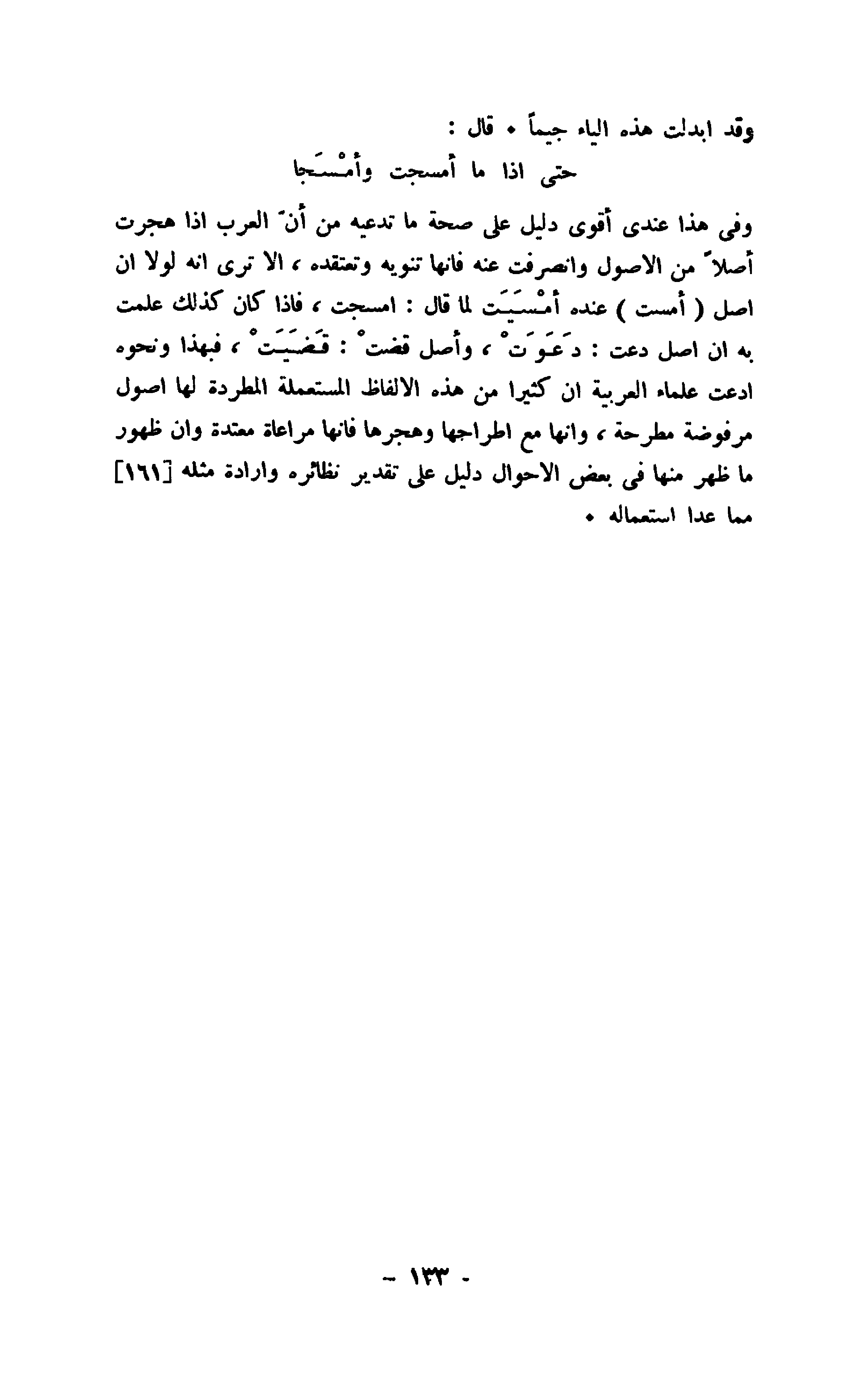وفي هذا عندي أقوى دليل على صحة ما تدعيه من أنّ العرب إذا هجرت أصلا من الأصول وانصرفت عنه فإنها تنويه وتعقيده، ألا ترى أنه لولا أن اصل " أمست " عنده أمْسَيَت لما قال: أمسجت، فإذا كان كذلك علمت به أن أصل دعت: دَعَوَتْ، وأصل قضتْ: قَضَيَتْ، فبهذا ونحوه ادعت علماء العربية إن كثيرا من هذه الألفاظ المستعملة المطردة لها أصول مرفوضة مطرحة، وإنها مع اطراحها وهجرها فإنها مراعاة معتدة وإن ظهور ما ظهر منها في بعض الأحوال دليل على تقدير نظائره وإرادة مثله مما عدا استعماله.