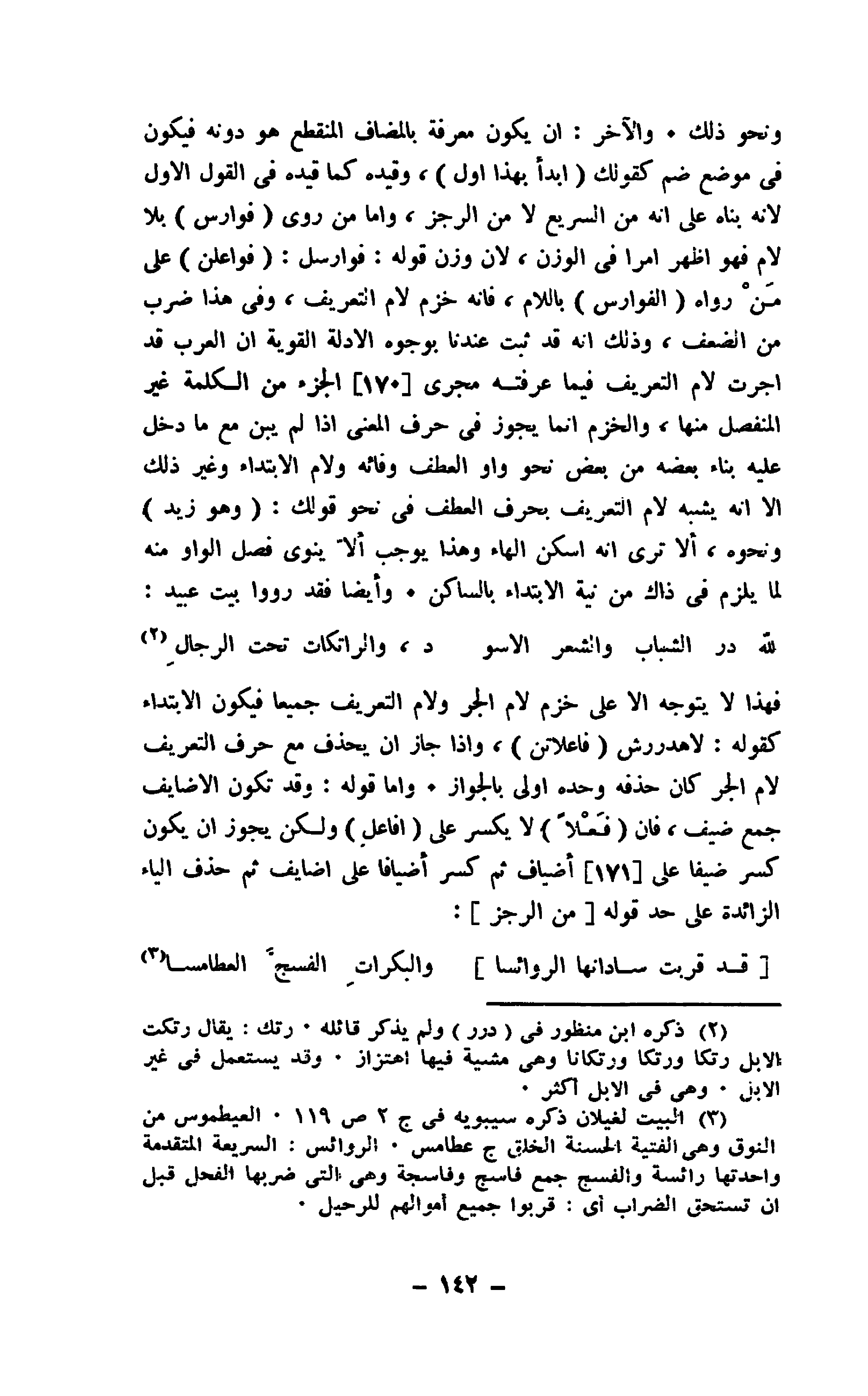 فهذا لا يتوجه إلا على خزم لام الجر ولام التعريف جميعا فيكون الابتداء كقوله: لا هدررش " فاعلاتن "، وإذا جاز أن يحذف مع حرف التعريف لام الجر كان حذفه وحده أولى بالجواز. وأما قوله: وقد تكون الأضايف جمع ضيف، فإن " فَعْلاً " لا يكسر على " أفاعل " ولكن يجوز أن يكون كسر ضيفا على أضياف ثم كسر أضيافا على أضايف ثم حذف الياء الزائدة على حد قوله " من الرجز ":