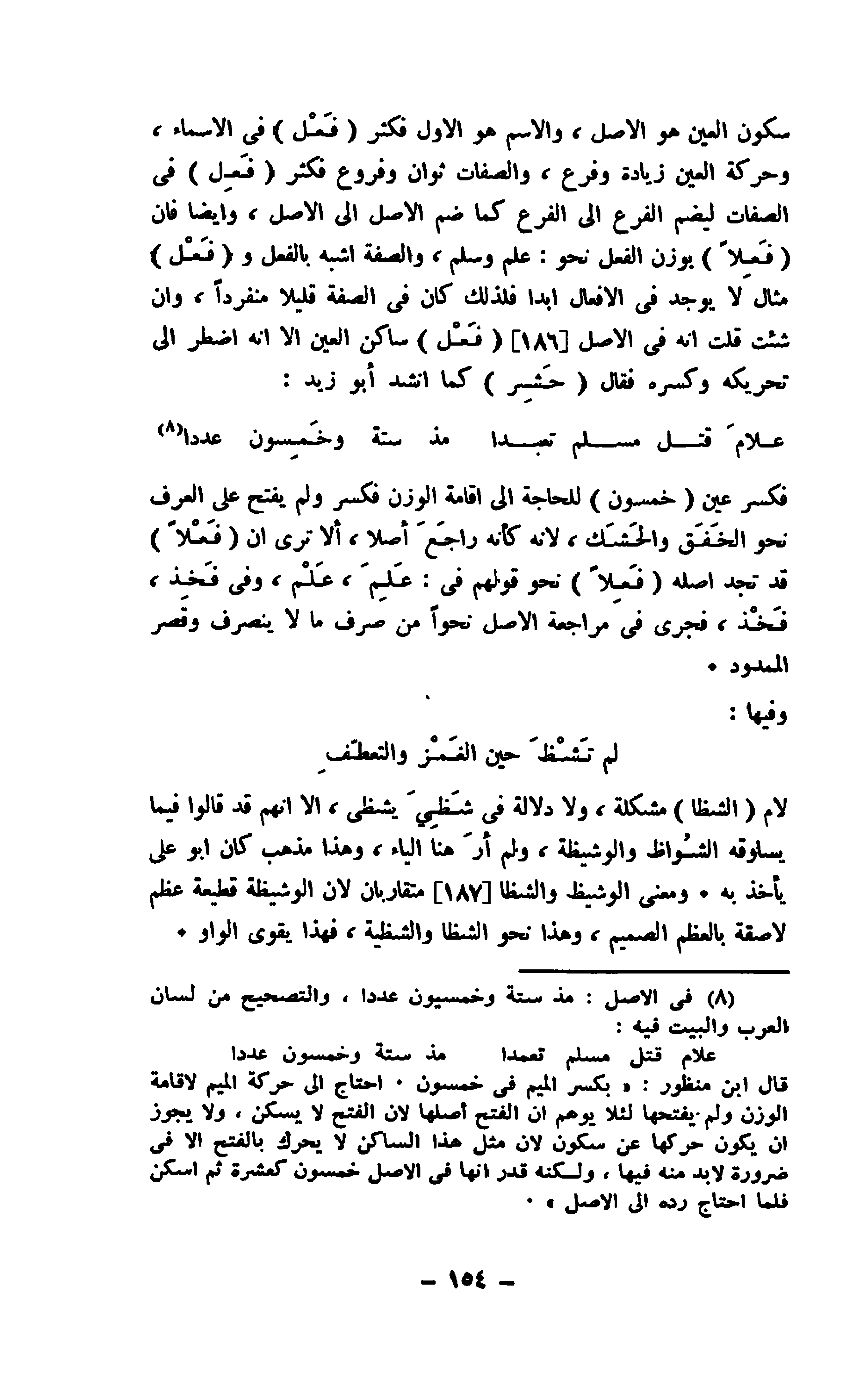 فكسر عين " خمسون " للحاجة إلى إقامة الوزن فكسر ولم يفتح على العرف نحو الخَفَف والحَشَك، له كأنه راجَعَ أصلا، ألا ترى أن " فَعْلاً " قد تجد اصله " فَعِلاً " نحو قولهم في: عَلِمَ، عَلْم، وفي فَخِذ، فَخْذ، فجرى في مراجعة الأصل نحواً من صرف ما لا ينصرف وقصر الممدود.