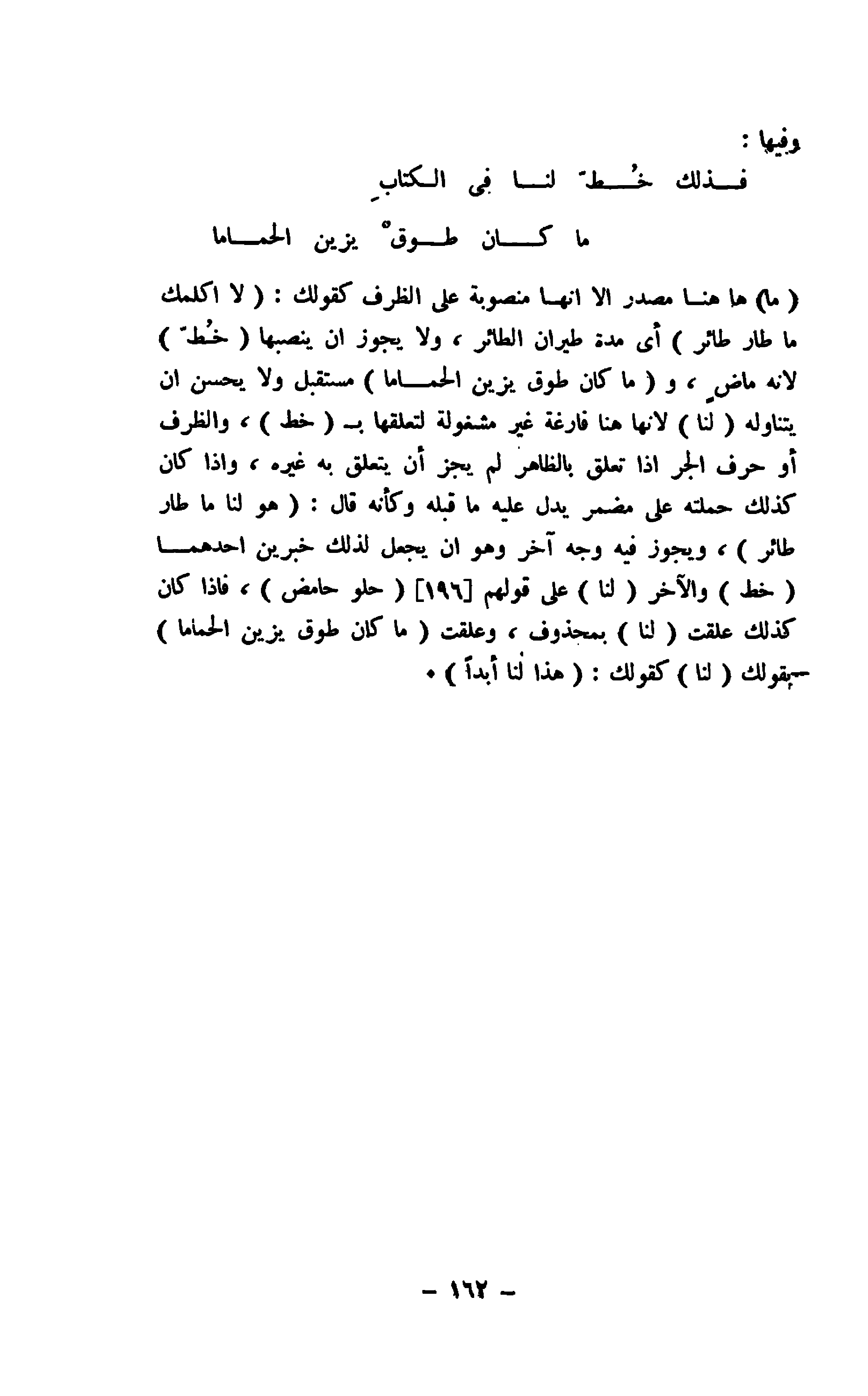 " ما " ها هنا مصدر إلا إنها منصوبة على الظرف كقولك: " لا أكلمك ما طار طائر " أي مدة طيران الطائر، ولا يجوز أن ينصبها " خُطّ " لانه ماضٍ، و " ما كان طوق يزين الحماما " مستقبل ولا يحسن ان يتناوله " لنا " لأنها هنا فارغة غير مشغولة لتعلقها ب " خط "، والظرف أو حرف الجر اذا تعلق بالظاهر لم يجز أن يتعلق به غيره، وإذا كان كذلك حملته على مضمر يدل عليه ما قبله وكأنه قال: " هو لنا ما طار طائر "، ويجوز فيه وجه آخر وهو أن يجعل لذلك خبرين أحدهما " خط " والآخر " لنا " على قولهم " حلو حامض "، فإذا كان كذلك علقت " لنا " بمحذوف، وعلقت " ما كان طوق يزين الحماما " بقولك " لنا " كقولك: " هذا لنا أبداً ".