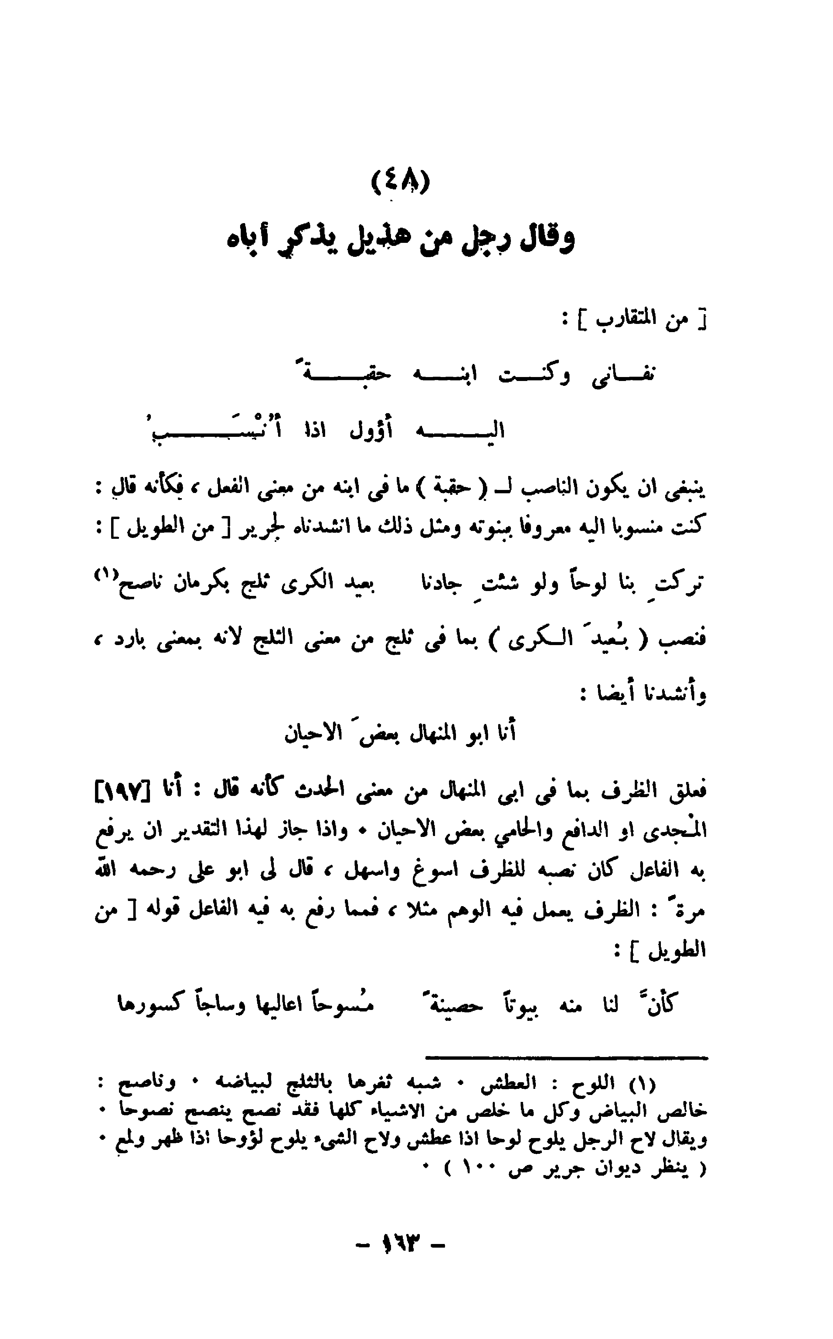 فنصب " بُعيدَ الكرى " بما في ثلج من الثلج لانه بمعنى بارد، وأنشدنا أيضا: