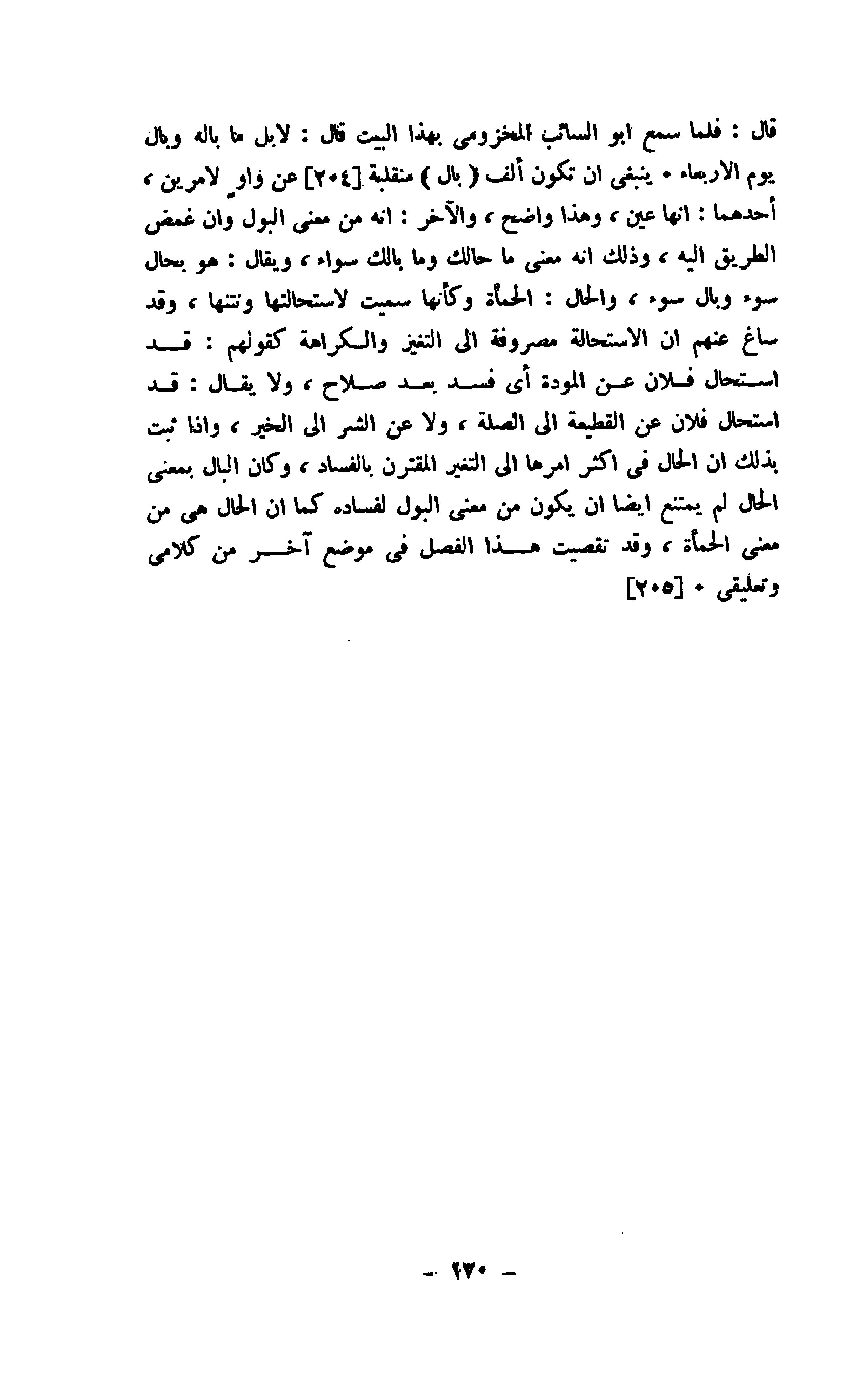 قال: فلما سمع أبو السائب المخزومي بهذا البيت قال: لا بل ما باله وبال يوم الأربعاء. ينبغي أن تكون ألف " بال " منقلبة عن واو لامرين، أحدهما: انها عين، وهذا واضح، والآخر: انه من معنى البول وان غمض الطريق إليه، وذلك انه معني ما حالك وما بالك سواء، ويقال: هو بحال سوء وبال سوء، والحال: الحمأة وكأنها سميت لاستحالتها ونتنها، وقد ساغ عنهم أن الاستحالة مصروفة إلى التغير والكراهة كقولهم: قد استحال فلان عن المودة أي فسد بعد صلاح، ولا يقال: قد استحال فلان عن القطيعة إلى الصلة، ولا عن الشر غلى الخير، وإذا ثبت بذلك أن الحال في أكثر أمرها إلى التغير المقترن بالفساد، وكان البال بمعنى الحال لم يمتنع أيضا أن يكون من معنى البول لفساده كما إن الحال هي من معنى الحمأة، وقد تقصيت هذا الفصل في موضع آخر من كلامي وتعليقي.