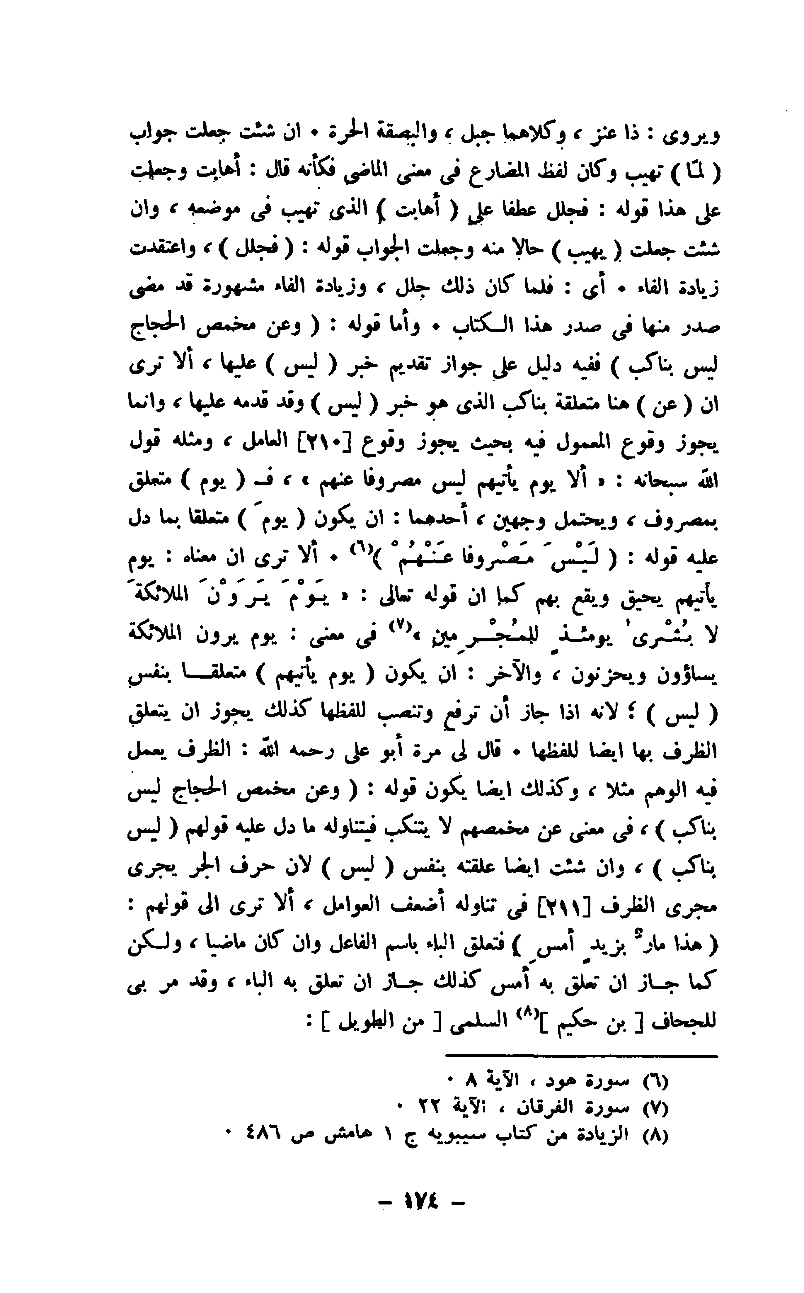 ويروى: ذا عنز، وكلاهما جبل، والبقة الحرة. إن شئت جعلت جواب " لمّا " تهيب وكان لفظ المضارع في معنى الماضي كأنه قال: أهابت وجعلت على هذا قوله: فجلل عطفا على " أهابت " الذي تهيب في موضعه، وإن شئت جعلت " يهيب " حالا منه وجعلت الجواب قوله: " فجلل "، واعتقدت زيادة الفاء. أي: فلما كان ذلك جلل، وزيادة الفاء مشهورة قد مضى صدر منها في صدر هذا الكتاب. وأما قوله: " وعن مخمص الحجاج ليس بناكب " ففيه دليل على جواز تقديم خبر " ليس " عليها، ألا ترى أن " عن " هنا متعلقة بناكب الذي هو خبر " ليس " وقد قدمه عليها، وإنما يجوز وقوع المعمول فيه بحيث يجوز وقوع العامل، ومثله قول الله سبحانه: (ألا يوم يأتيهم ليس مصروفا عنهم)، ف " يوم " متعلق بمصروف، ويحتمل وجهين، أحدهما: أن يكون " يوم " متعلقا بما دل عليه: (لَيْسَ مَصْروفا عَنْهُمْ). ألا ترى أن معناه: يوم يأتيهم يحيق ويقع بهم كما أن قوله تعالى: (يَوْمَ يَرَوْنَ الملائكة لا بُشْرى يومئذ للمُجرمين) في معنى: يوم يرون الملائكة يساؤون ويحزنون، والآخر: أن يكون (يوم يأتيهم) متعلقا بنفس " ليس "؛ لانه إذا جاز أن ترفع وتنصب للفظها كذلك يجوز أن يتعلق الظرف بها أيضا للفظها. قال لي مرة أبو علي رحمه الله: الظرف يعمل فيه الوهم مثلا، وكذلك أيضا يكون قوله: " وعن مخمص الحجاج ليس بناكب "، في معنى عن مخمصهم لا ينكب فيتناوله ما دل عليه قولهم " ليس بناكب "، وإن شئت أيضا علقته بنفس " ليس " لأن حرف الجر يجري مجرى الظرف في تناوله أضعف العوامل، ألا ترى إلى قولهم: " هذا مارٌ بزيدٍ أمسِ " فتعلق الباء باسم الفاعل وإن كان ماضيا، ولكن كما جاز أن تعلق به أمس كذلك جاز أن تعلق به الباء، وقد مر بي للجحاف " بن حكيم " السلمي " من الطويل ":