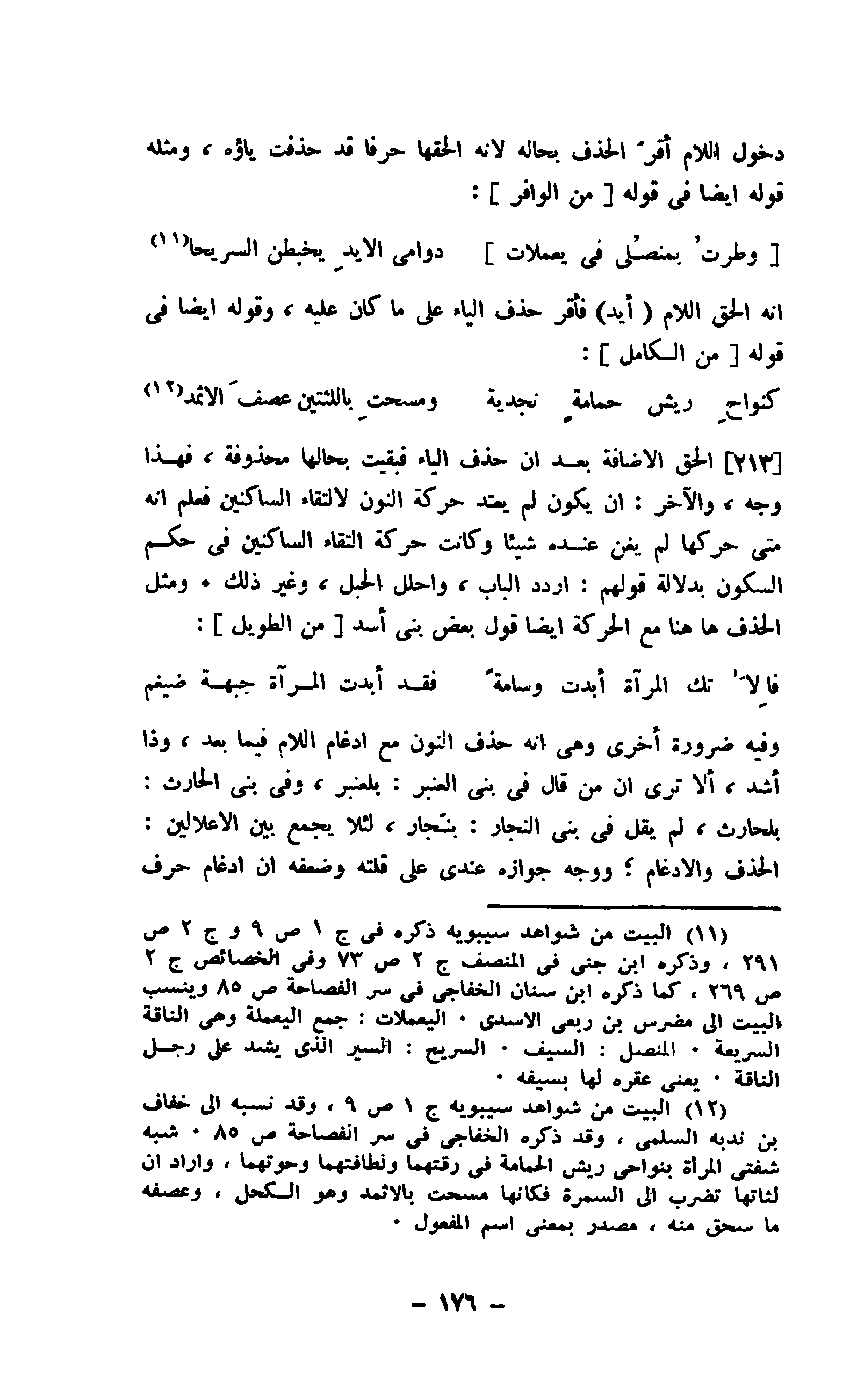 وفيه ضرورة أخرى وهي إنه حذف النون مع إدغام اللام فيما بعد، وذا أشد، ألا ترى إن من قال في بني العنبر: بلعنبر، وفي بني الحارث: بلحارث، لم يقل في بني النجار: بنّجار، لئلا يجمع بين الإعلالين: الحذف والإدغام؛ ووجه جوازه عندي على قلته وضعفه إن إدغام حرف