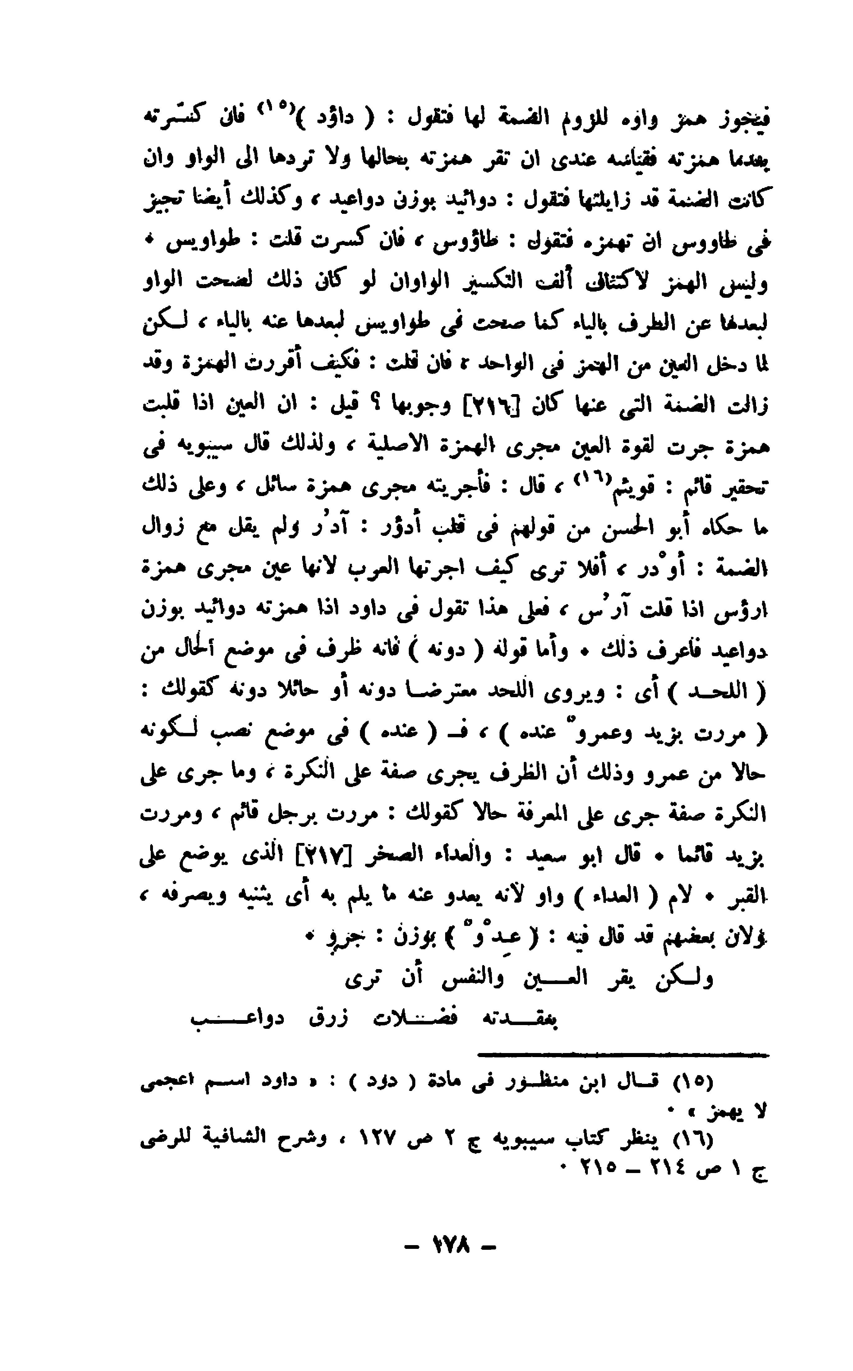 فيجوز همز واوه للزوم الضمة لها فتقول: " داؤد " فإن كسّرته بعدما همزته فقياسه عندي إن تقر همزته بحالها ولا تردها إلى الواو وإن كانت الضمة قد زايلتها فتقول: دوائيد بوزن دواعيد، وكذلك أيضا تجيز في طاووس إن تهمزه فتقول: طاؤوس، فإن كسرت قلت: طواويس. وليس الهمز لاكتناف ألف التكسير الواوان لو كان ذلك لصحت الواو لبعدها عن الطرف بالياء كما صحت في طواويس لبعدها عنه بالياء، لكن لما دخل العين من الهمز في الواحد، فإن قلت: فكيف أقررت الهمزة وقد زالت الضمة التي عنها كان وجوبها؟ قيل: إن العين إذا قلبت همزة جرت لقوة العين مجرى الهمزة الاصلية، ولذلك قال سيبويه في تحقير قائم: قويئم، قال: فأجريته مجرى همزة سائل، وعلى ذلك ما حكاه أبو الحسن من قولهم في قلب أدؤر: آدُر ولم يقل مع زوال الضمة: أوْدر، أفلا ترى كيف أجرتها العرب لأنها عين مجرى همزة أرؤس إذا قلت آرُس، فعلى هذا تقول في داود إذا همزته دوائيد بون دواعيد فأعرف ذلك. وأما قوله " دونه " فإنه ظرف في موضع الحال من " اللحد " أي: ويروي اللحد معترضا دونه أو حائلا دونه كقولك: " مررت بزيد وعمروٌ عنده "، ف " عنده " في موضع نصب لكونه حالا من عمرو وذلك أن الظرف يجري صفة على النكرة، وما جرى على النكرة صفة جرى على المعرفة حالا كقولك، مررت برجل قائم، ومررت بزيد قائما. قال أبو سعيد: والعداء الصخر الذي يوضع على القبر. لام " العداء " واو لأنه يعدو عنه ما يلم به أي يثنيه ويصرفه، ولأن بعضهم قد قال فيه: " عِدْوٌ " بوزن: جرو.