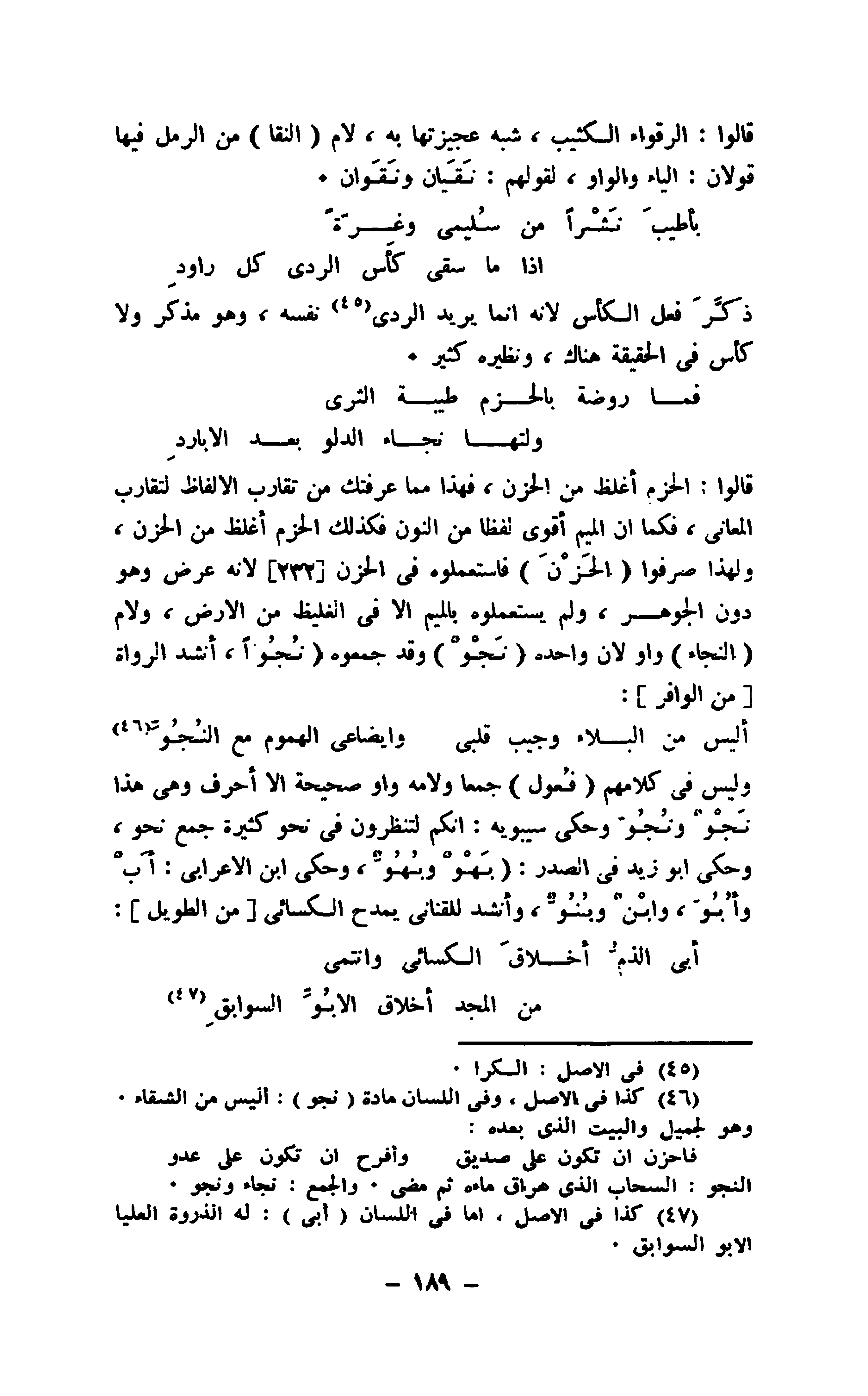 وليس في كلامهم " فُعول " جمعا ولامه واو صحيحة إلا أحرف وهي هذا نَجْوٌ ونُجُوّ وحكى سيبويه: إنكم لتنظرون في نحو كثيرة جمع نحو، وحكى أبو زيد في الصدر: " بَهْوٌ وبُهُوٌ، وحكى ابن الأعرابي: أَبٌ وأُبُوّ، وابْنٌ وبُنُوٌ، وأنشد للقاني يمدح الكسائي " من الطويل ":