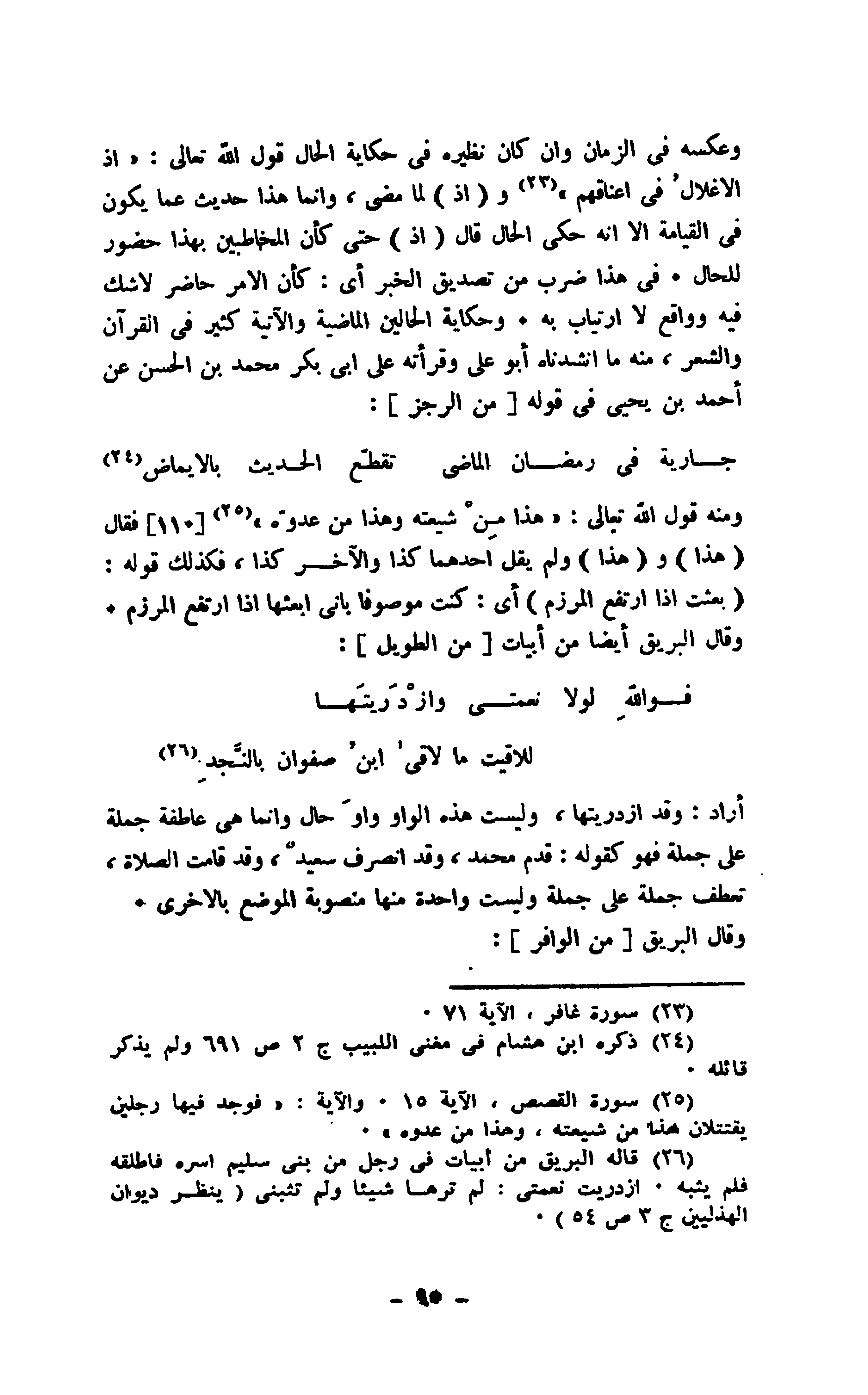 وعكسه في الزمان وإن كان نظيره في حكاية الحال قول الله تعالى: (إذ الأغلال في أعناقهم) و " إذ " لما مضى، وإنما هذا حديث عما يكون في القيامة إلا إنه حكى الحال قال " إذ " حتى كأن المخاطبين بهذا حضور للحال. في هذا ضرب من تصديق الخبر أي: كأن الأمر حاضر لا شك فيه وواقع لا ارتياب به. وحكاية الحالين الماضية والآتية كثير في القرآن والشعر، منه ما أنشدناه أبو علي وقرأته على أبي بكر محمد بن الحسن عن أحمد بن يحيى في قوله " من الرجز ":