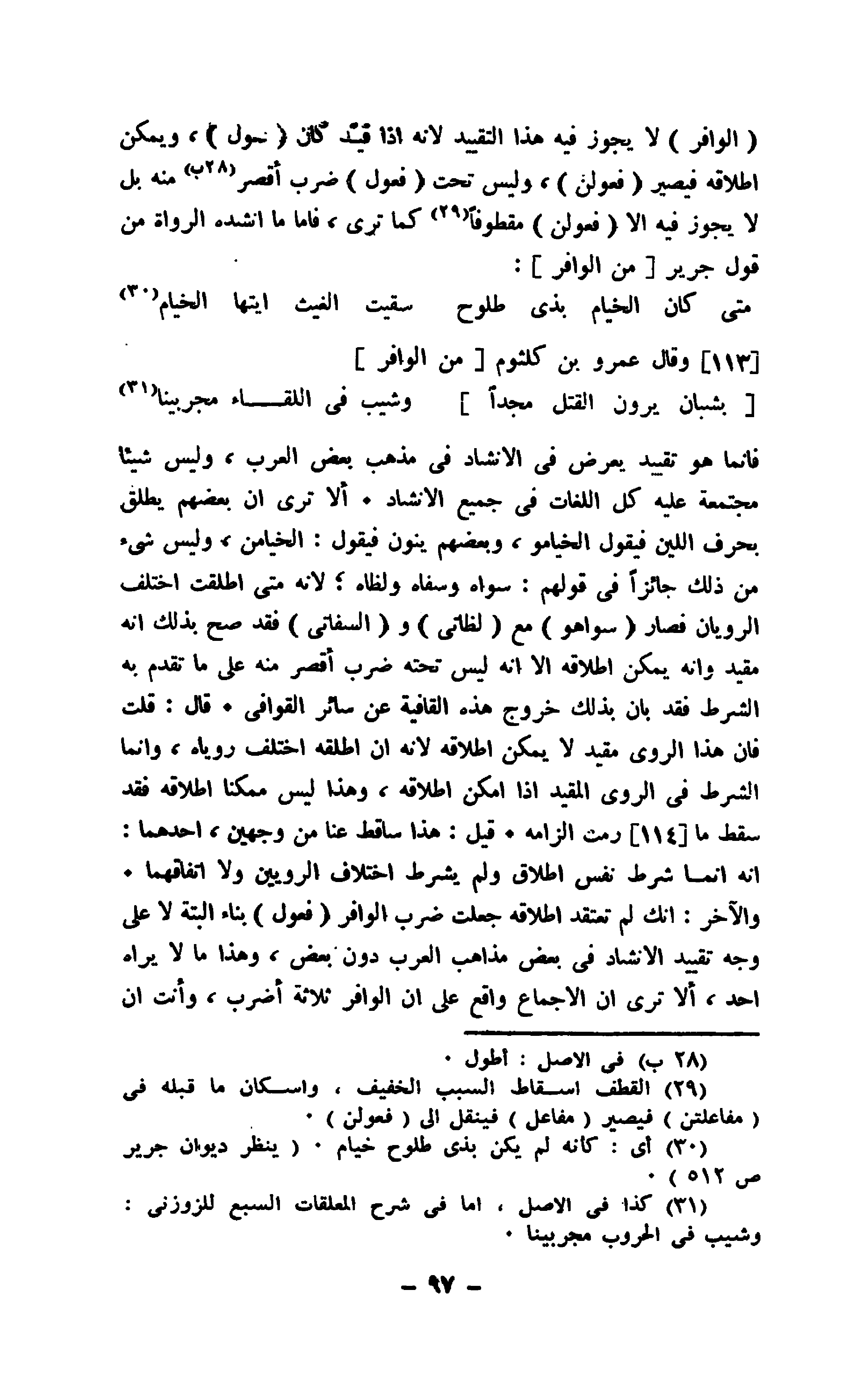 " الوافر " لا يجوز فيه هذا التقيد لانه إذا قَيَد كان " فعول "، ويمكن إطلاقه قصير " فعولن "، وليس تحت " فعول " ضرب اقصر منه بل لا يجوز غبه إلا " فعولن " مقطوفا كما ترى، فأما ما أنشده الرواة من قول جرير " من الوافر ":