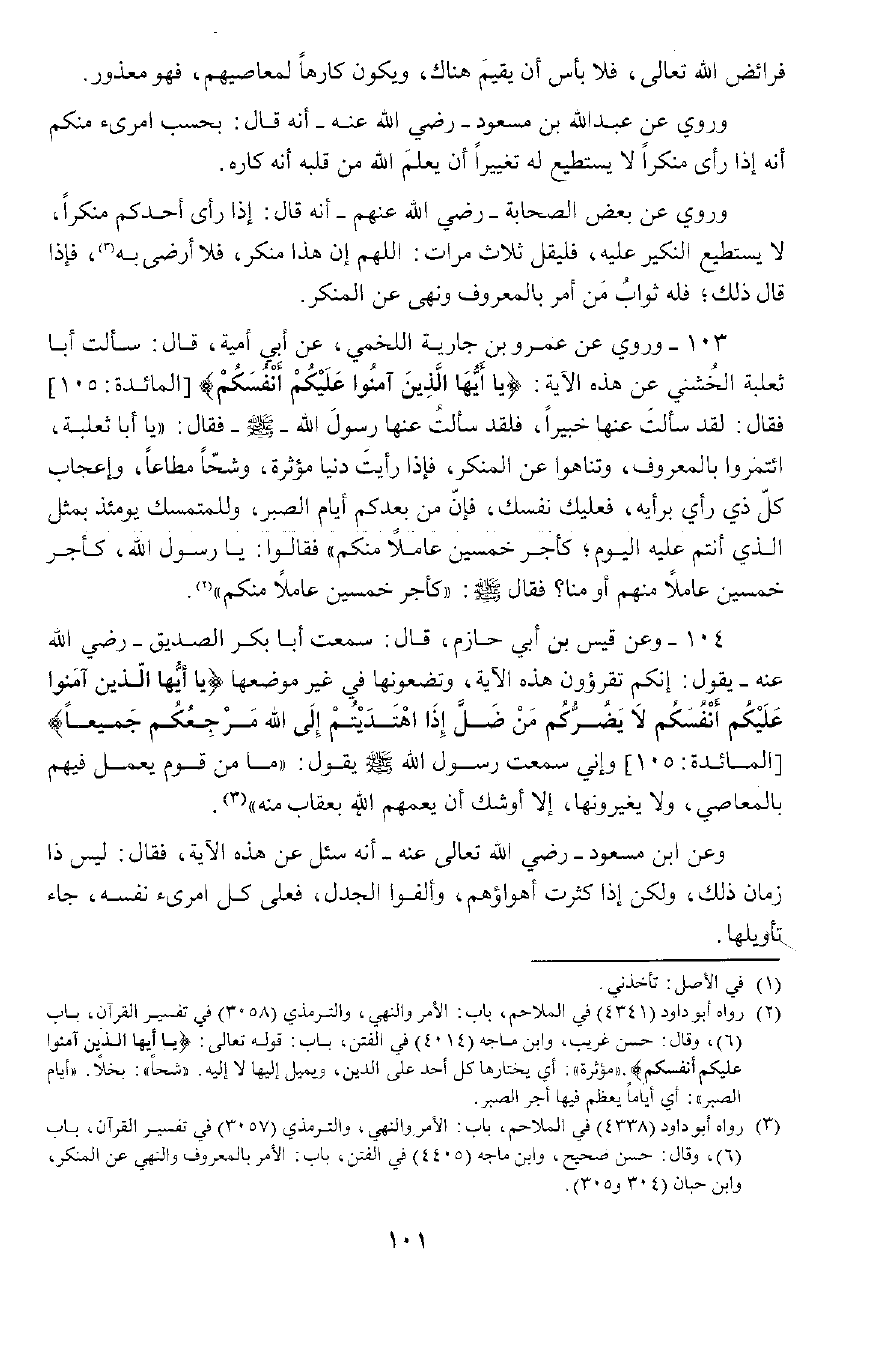 104 - وَعَنْ قَيْسِ بْنِ أَبِي حَازِمٍ , قَالَ: سَمِعْتُ أَبَا بَكْرٍ الصِّدِّيقَ رَضِيَ اللَّهُ تَعَالَى عَنْهُ , يَقُولُ: إِنَّكُمْ تَقْرَءُونَ هَذِهِ الْآيَةَ وَتَضَعُونَهَا فِي غَيْرِ مَوْضِعِهَا: {يَأَيُّهَا الَّذِينَ آمَنُوا عَلَيْكُمْ أَنْفُسَكُمْ لا يَضُرُّكُمْ مَنْ ضَلَّ إِذَا اهْتَدَيْتُمْ إِلَى اللَّهِ مَرْجِعُكُمْ جَمِيعًا} [المائدة: 105] وَإِنِّي سَمِعْتُ رَسُولَ اللَّهِ صَلَّى اللَّهُ عَلَيْهِ وَسَلَّمَ يَقُولُ: «مَا مِنْ قَوْمٍ يُعْمَلُ فِيهِمْ بِالْمَعَاصِي، وَلَا يُغَيِّرُونَهَا إِلَّا أَوْشَكَ أَنْ يَعُمَّهُمُ اللَّهُ تَعَالَى بِعِقَابٍ مِنْهُ» وَعَنِ ابْنِ مَسْعُودٍ رَضِيَ اللَّهُ تَعَالَى عَنْهُ , أَنَّهُ سُئِلَ عَنْ هَذِهِ الْآيَةِ فَقَالَ لَيْسَ ذَا زَمَانُ ذَلِكَ، وَلَكِنْ إِذَا كَثُرَتْ أَهْوَاؤُهُمْ وَأَلِفُوا الْجِدَالَ فَعَلَى كُلِّ امْرِئٍ نَفْسَهُ.