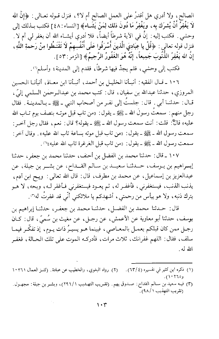 107 - قَالَ: حَدَّثَنَا مُحَمَّدُ بْنُ الْفَضْلِ بْنُ أَحْنَفَ، حَدَّثَنَا مُحَمَّدُ بْنُ جَعْفَرٍ، حَدَّثَنَا إِبْرَاهِيمُ بْنُ يُوسُفَ، حَدَّثَنَا سَعِيدُ بْنُ سَالِمَ الْقَدَّاحُ، عَنْ بِشْرِ ابْنِ جَبَلَةَ، عَنْ عَبْدِ الْعَزِيزِ بْنِ إِسْمَاعِيلَ، عَنْ مُحَمَّدِ بْنِ مُطَرِّفٍ، قَالَ: قَالَ اللَّهُ تَعَالَى: «وَيْحَ ابْنِ آدَمَ يُذْنِبُ الذَّنْبَ فَيَسْتَغْفِرُنِي فَأَغْفِرُ لَهُ، ثُمَّ يَعُودُ فَيَسْتَغْفِرُنِي فَأَغْفِرُ لَهُ، وَيْحَهُ لَا هُوَ يَتْرُكُ ذَنْبَهُ وَلَا يَيْأَسُ مِنْ رَحْمَتِي أُشْهِدُكُمْ يَا مَلَائِكَتِي أَنِّي قَدْ غَفَرْتُ لَهُ»