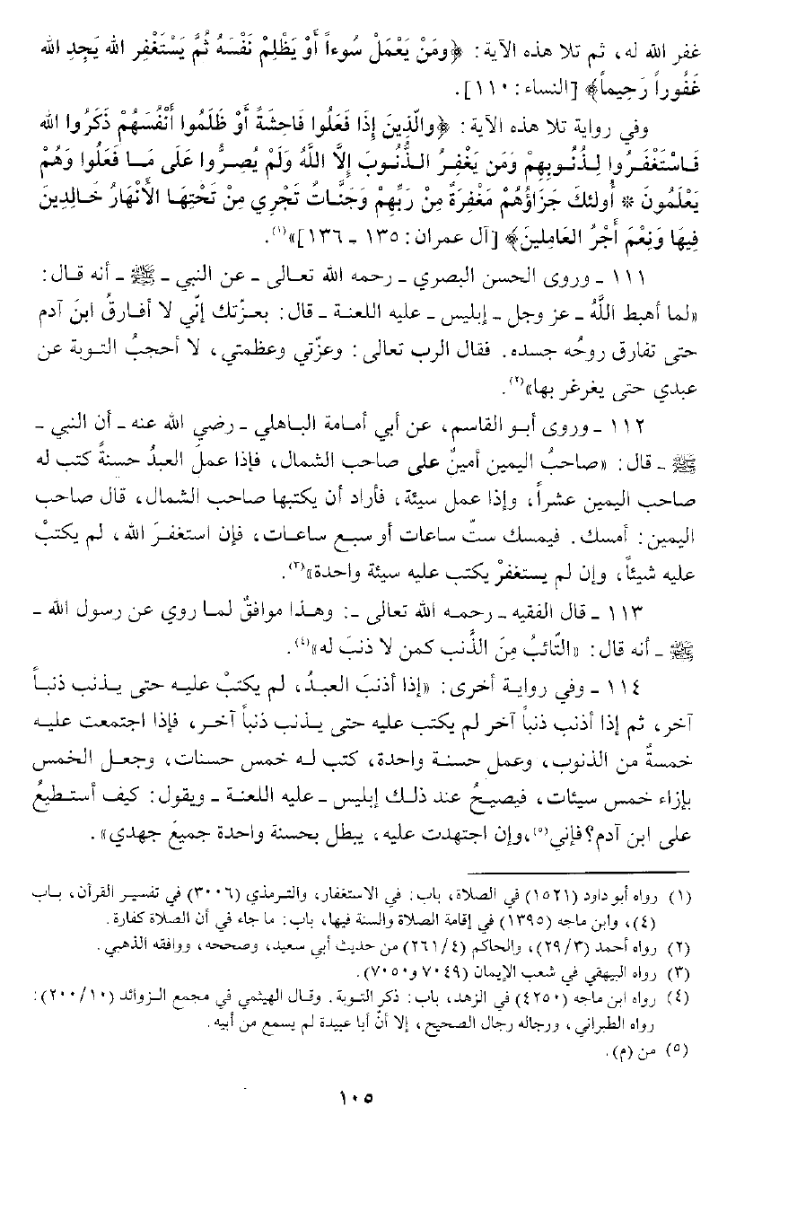114 - وَرُوِيَ فِي رِوَايَةٍ أُخْرَى: " إِنَّ الْعَبْدَ إِذَا أَذْنَبَ لَمْ يُكْتَبْ عَلَيْهِ حَتَّى يُذْنِبَ ذَنْبًا آخَرَ فلَمْ يُكْتَبْ عَلَيْهِ حَتَّى يُذْنِبَ ذَنْبًا آخَرَ، فَإِذَا اجْتَمَعَتْ عَلَيْهِ خَمْسَةٌ مِنَ الذُّنُوبِ، وَعَمِلَ حَسَنَةً وَاحِدَةً كُتِبَ لَهُ خَمْسُ حَسَنَاتٍ، وَجُعِلَ الْخَمْسُ بِإِزَاءِ خَمْسِ سَيِّئَاتٍ فَيَصِيحُ عِنْدَ ذَلِكَ إِبْلِيسُ عَلَيْهِ اللَّعْنَةُ وَيَقُولُ: كَيْفَ أَسْتَطِيعُ عَلَى ابْنِ آدَمَ، وَإِنِّي وَإِنِ اجْتَهَدْتُ عَلَيْهِ يُبْطِلُ بِحَسَنَةٍ وَاحِدَةٍ جَمِيعَ جَهْدِي ".