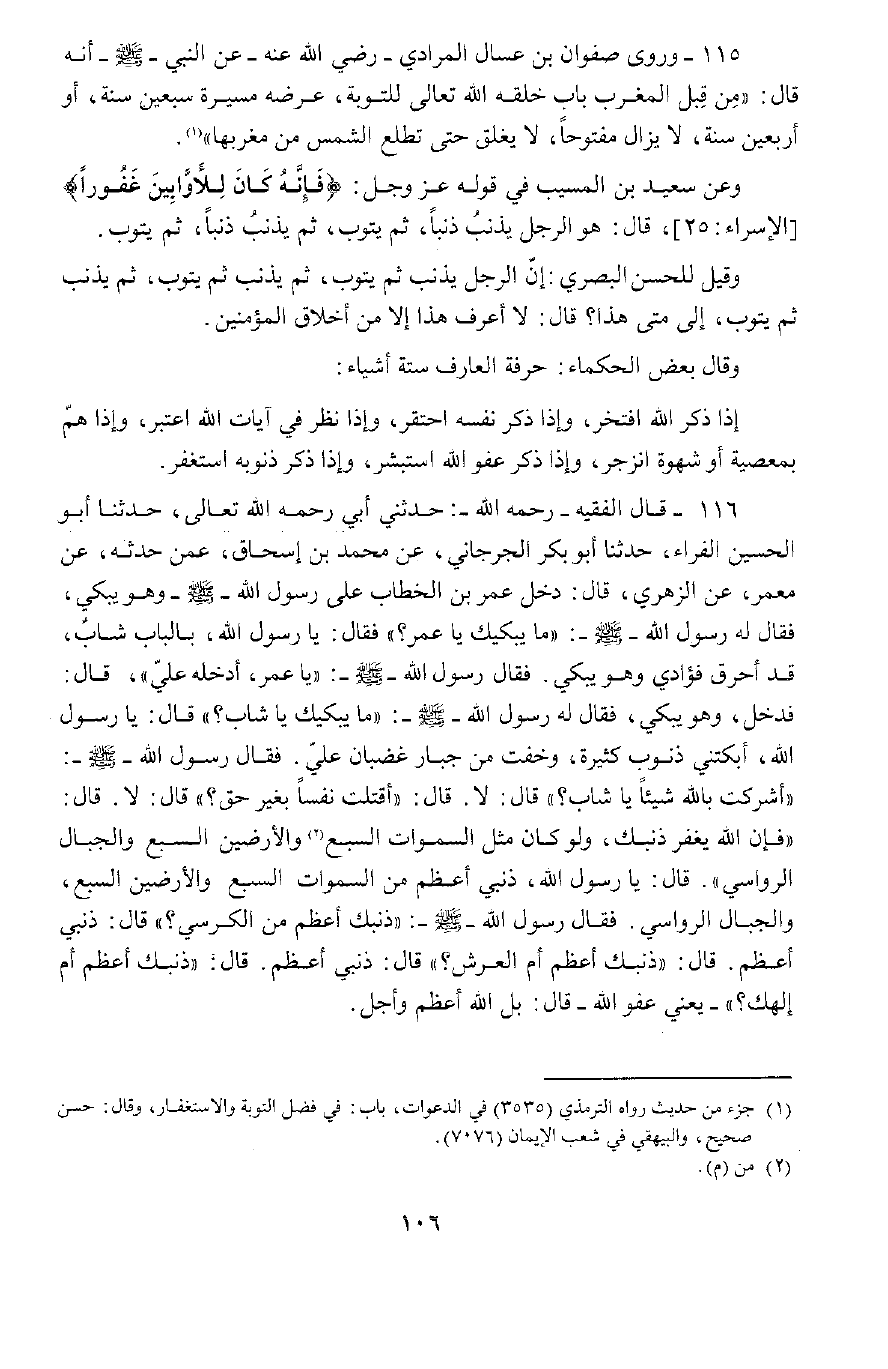 115 - وَرَوَى صَفْوَانُ بْنُ عَسَّالٍ الْمُرَادِيُّ رَضِيَ اللَّهُ تَعَالَى عَنْهُ عَنِ النَّبِيِّ صَلَّى اللَّهُ عَلَيْهِ وَسَلَّمَ أَنَّهُ قَالَ: «مِنْ قِبَلِ الْمَغْرِبِ بَابٌ خَلَقَهُ اللَّهُ تَعَالَى لِلتَّوْبَةِ، عَرْضُهُ مَسِيرَةُ سَبْعِينَ سَنَةً، أَوْ أَرْبَعِينَ سَنَةً لَا يَزَالُ مَفْتُوحًا لَا يُغْلَقُ، حَتَّى تَطْلُعَ الشَّمْسُ مِنْ مَغْرِبِهَا» وَعَنْ سَعِيدِ بْنِ الْمُسَيِّبِ , فِي قَوْلِهِ عَزَّ وَجَلَّ: {فَإِنَّهُ كَانَ لِلأَوَّابِينَ غَفُورًا} [الإسراء: 25] ، قَالَ هُوَ الرَّجُلُ يُذْنِبُ ذَنْبًا ثُمَّ يَتُوبُ، ثُمَّ يُذْنِبُ ذَنْبًا ثُمَّ يَتُوبُ.