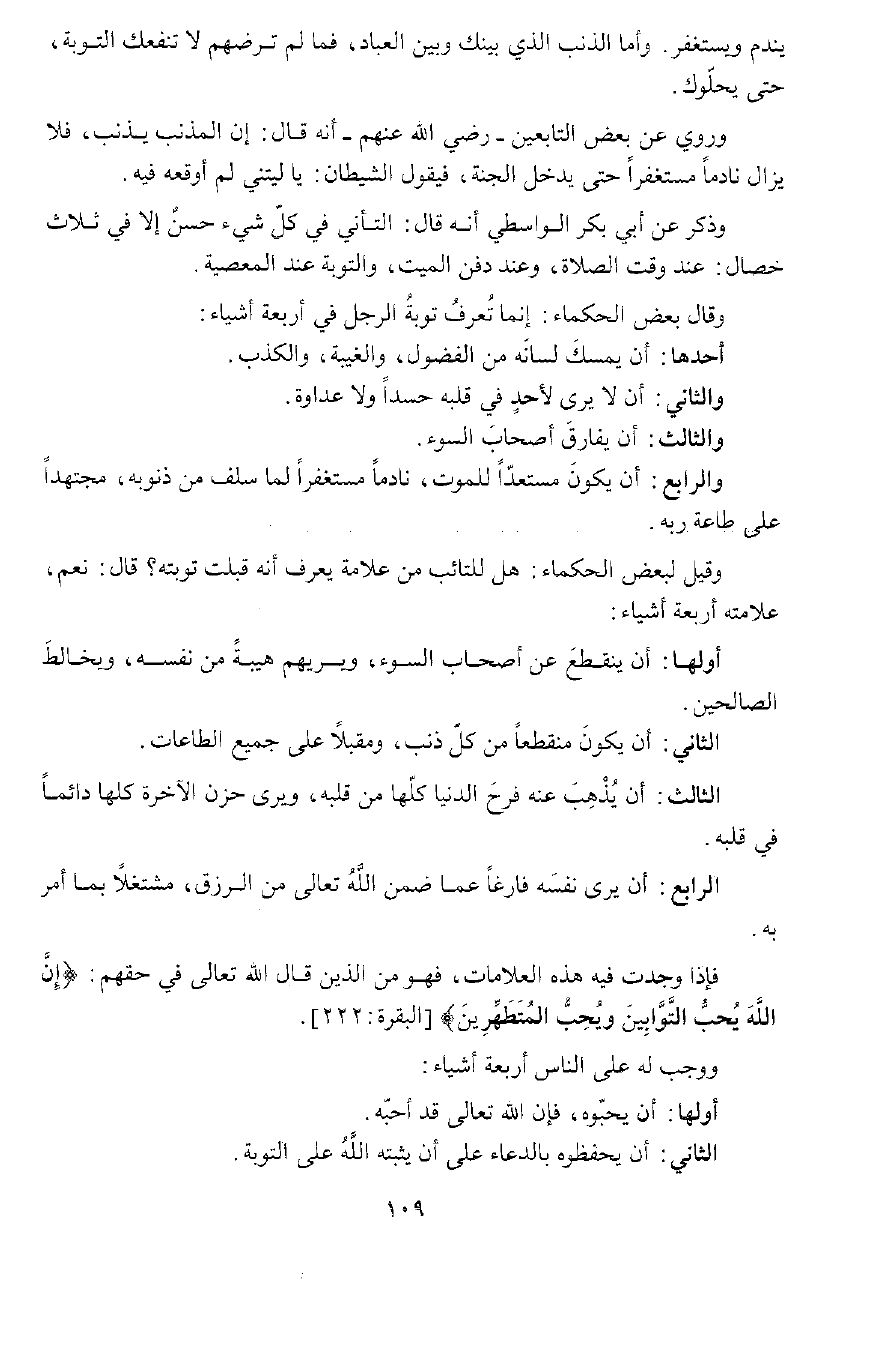 وَقِيلَ لِبَعْضِ الْحُكَمَاءِ هَلْ لِلتَّائِبِ مِنْ عَلَامَةٍ يَعْرِفُ أَنَّهُ قُبِلَتْ تَوْبَتُهُ؟ قَالَ: نَعَمْ عَلَامَتُهُ أَرْبَعَةُ أَشْيَاءَ: أَوَّلُهَا أَنْ يَنْقَطِعَ عَنْ أَصْحَابِ السُّوءِ وَيُرِيهِمْ هَيْبَةً مِنْ نَفْسِهِ، وَيُخَالِطَ الصَّالِحِينَ، وَالثَّانِي أَنْ يَكُونَ مُنْقَطِعًا عَنْ كُلِّ ذَنْبٍ وَمُقْبِلًا عَلَى جَمِيعِ الطَّاعَاتِ.