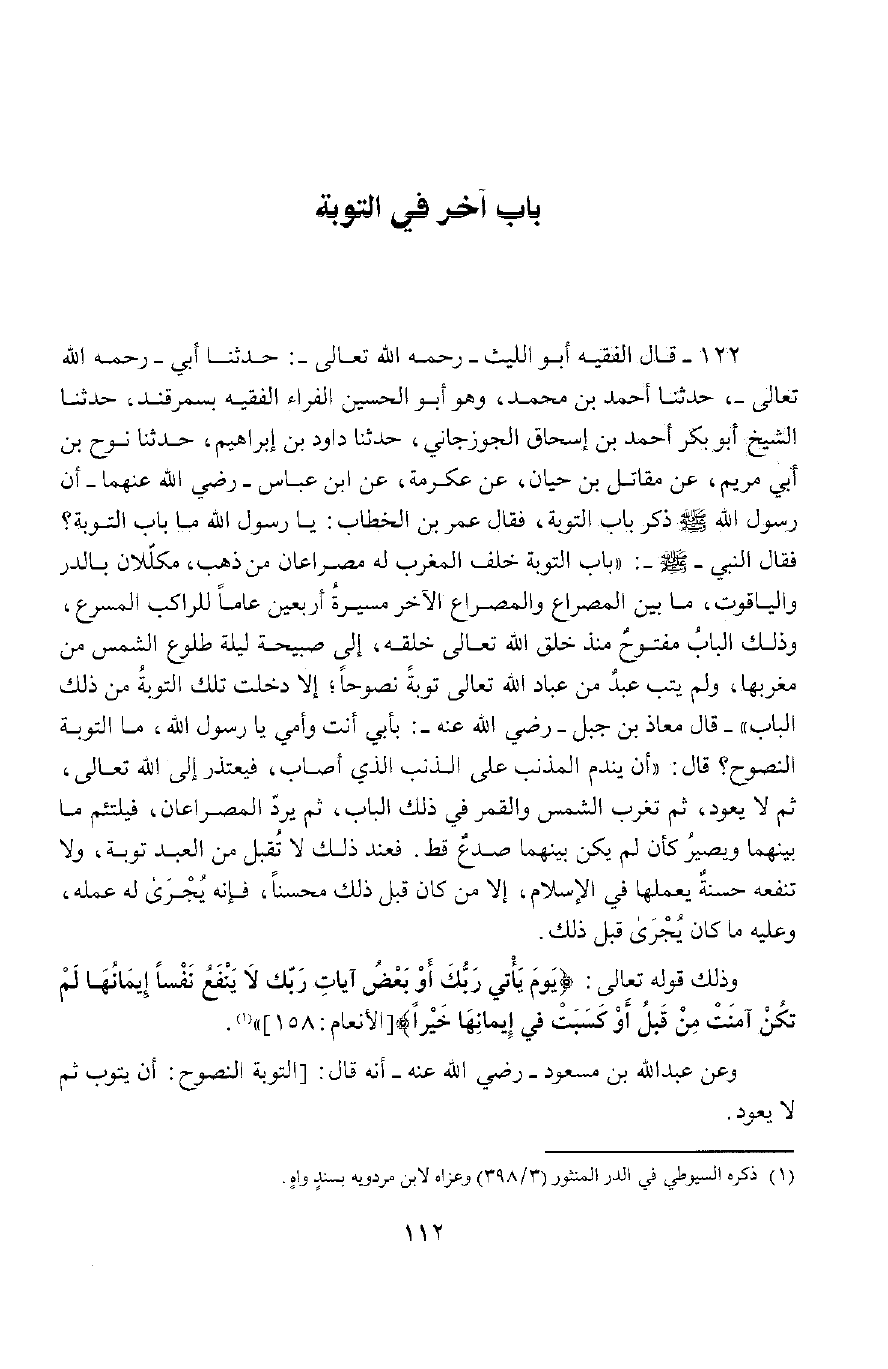 122 - حَدَّثَنَا أَبِي رَحِمَهُ اللَّهُ تَعَالَى، حَدَّثَنَا أَحْمَدُ بْنُ مُحَمَّدٍ وَهُوَ أَبُو الْحُسَيْنِ الْفَرَّاءُ وَالْفَقِيهُ بِسَمَرْقَنْدَ , حَدَّثَنَا الشَّيْخُ أَبُو بَكْرٍ أَحْمَدُ بْنُ إِسْحَاقَ الْجُرْجَانِيُّ، حَدَّثَنَا دَاوُدُ بْنُ إِبْرَاهِيمَ , حَدَّثَنَا نُوحُ بْنُ أَبِي مَرْيَمَ، عَنْ مُقَاتِلِ بْنِ حَيَّانَ، عَنْ عِكْرِمَةَ، عَنْ ابْنِ عَبَّاسٍ رَضِيَ اللَّهُ تَعَالَى عَنْهُمَا , أَنَّ رَسُولَ اللَّهِ صَلَّى اللَّهُ عَلَيْهِ وَسَلَّمَ ذَكَرَ بَابَ التَّوْبَةِ، فَقَالَ عُمَرُ بْنُ الْخَطَّابِ: يَا رَسُولَ اللَّهِ مَا بَابُ التَّوْبَةِ؟ فَقَالَ النَّبِيُّ صَلَّى اللَّهُ عَلَيْهِ وَسَلَّمَ: «بَابُ التَّوْبَةِ خَلْفَ الْمَغْرِبِ، لَهُ مِصْرَاعَانِ مِنْ ذَهَبِ، مُكَلَّلَانِ بِالدُّرِّ وَالْيَاقُوتِ مَا بَيْنَ الْمِصْرَاعِ وَالْمِصْرَاعِ الْآخَرَ مَسِيرَةُ أَرْبَعِينَ عَامًا لِلرَّاكِبِ الْمُسْرِعِ، وَذَلِكَ الْبَابُ مَفْتُوحٌ مُنْذُ يَوْمِ خَلَقَ اللَّهُ تَعَالَى خَلْقَهُ إِلَى صَبِيحَةِ لَيْلَةِ طُلُوعِ الشَّمْسِ مِنْ مَغْرِبِهَا، وَلَمْ يَتُبْ عَبْدٌ مِنْ عِبَادِ اللَّهِ تَوْبَةً نَصُوحًا إِلَّا دَخَلَتْ تِلْكَ التَّوْبَةُ مِنْ ذَلِكَ الْبَابِ»