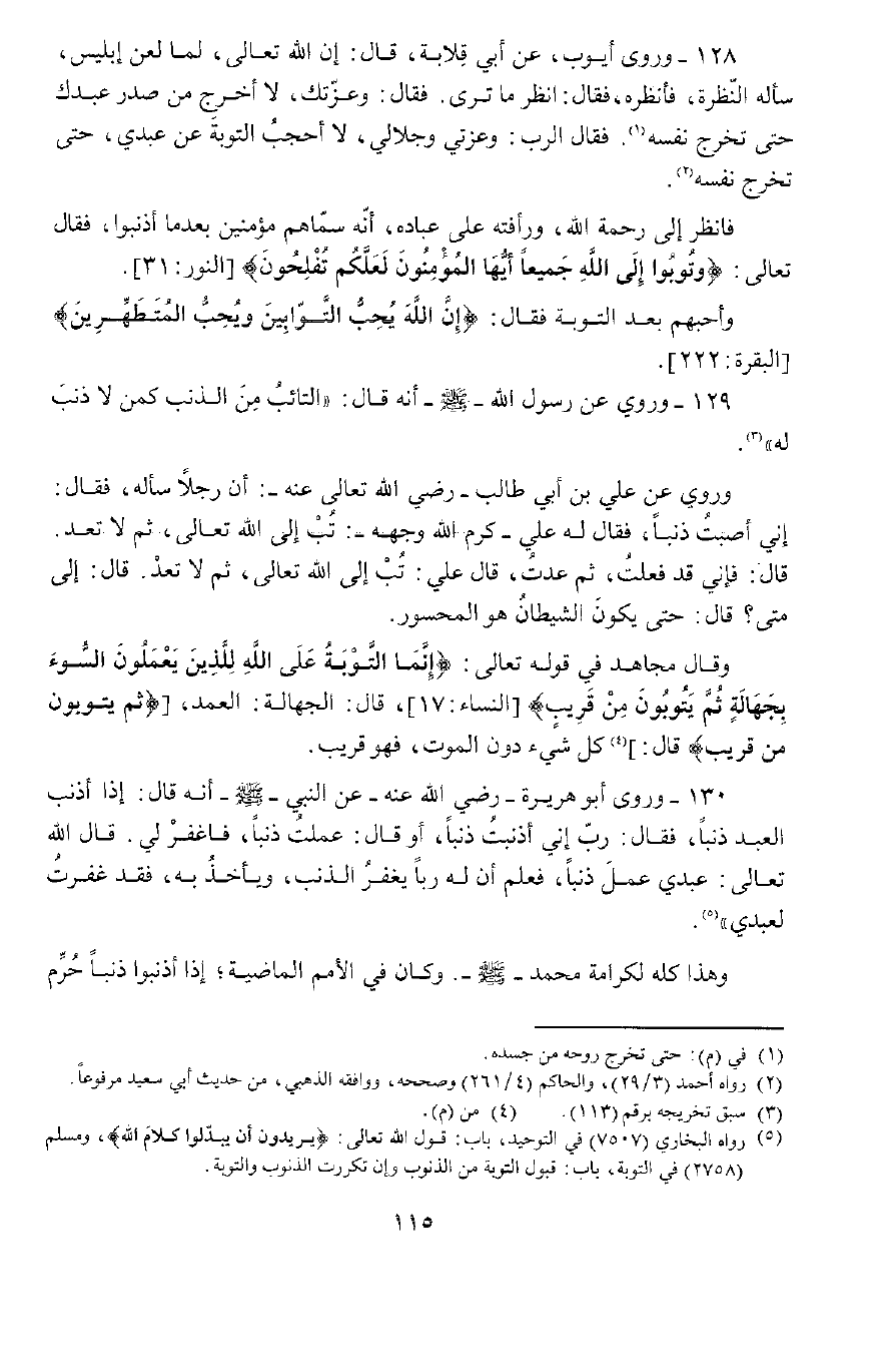 128 - وَرَوَى أَيُّوبُ عَنْ أَبِي قُلَابَةَ قَالَ: إِنَّ اللَّهَ تَعَالَى لَمَّا لَعَنَ إِبْلِيسَ سَأَلَهُ النَّظْرَةَ، فَأَنْظَرَهُ فَقَالَ: وَعِزَّتِكَ، لَا أَخْرُجُ مِنْ صَدْرِ عَبْدِكَ حَتَّى تَخْرُجَ نَفْسُهُ، فَقَالَ الرَّبُّ: وَعِزَّتِي وَجَلَالِي، لَا أَحْجُبُ التَّوْبَةَ عَنْ عَبْدِي حَتَّى تَخْرُجَ نَفْسُهُ.