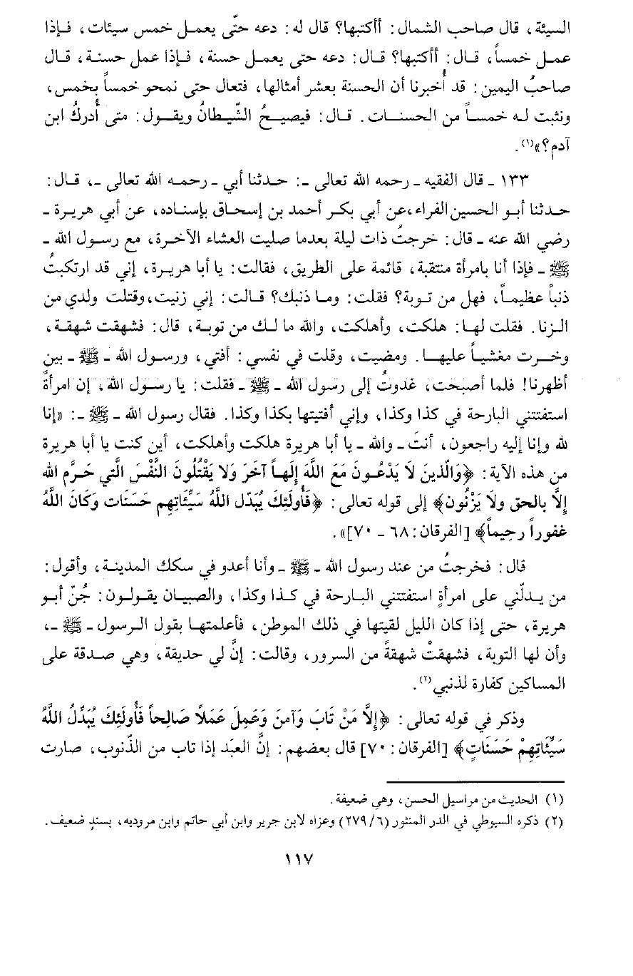 133 - حَدَّثَنَا أَبِي رَحِمَهُ اللَّهُ تَعَالَى، حَدَّثَنَا أَبُو الْحُسَيْنِ الْفَرَّاءُ، عَنْ أَبِي بَكْرٍ , بِإِسْنَادِهِ عَنْ أَبِي هُرَيْرَةَ رَضِيَ اللَّهُ تَعَالَى عَنْهُ , قَالَ: خَرَجْتُ ذَاتَ لَيْلَةٍ بَعْدَمَا صَلَّيْتُ الْعِشَاءَ الْآخِرَةَ مَعَ رَسُولِ اللَّهِ صَلَّى اللَّهُ عَلَيْهِ وَسَلَّمَ فَإِذَا أَنَا بَامْرَأَةٍ مُنْتَقِبَةٍ قَائِمَةٍ عَلَى الطَّرِيقِ، فَقَالَتْ: يَا أَبَا هُرَيْرَةَ، إِنِّي قَدِ ارْتَكَبْتُ ذَنْبًا عَظِيمًا، فَهَلْ لِي مِنْ تَوْبَةٍ؟ فَقُلْتُ: وَمَا ذَنْبُكِ؟ قَالَتْ: إِنِّي زَنَيْتُ وَقَتَلْتُ وَلَدِي مِنَ الزِّنَى، فَقُلْتُ لَهَا: هَلَكْتِ وَأَهْلَكْتِ، وَاللَّهِ مَا لَكِ مِنْ تَوْبَةٍ.