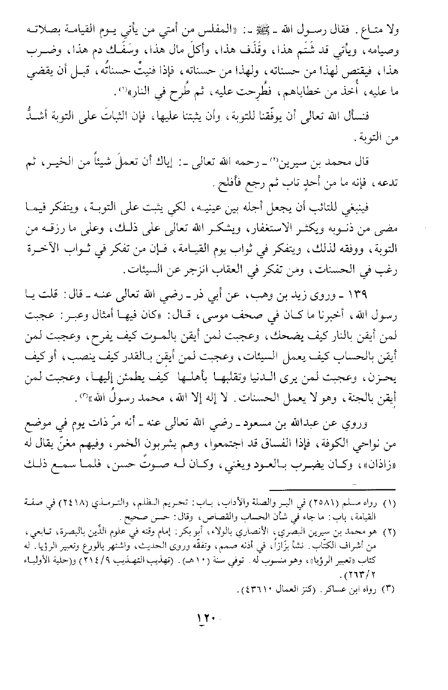 وَقَالَ مُحَمَّدُ بْنُ سِيرِينَ رَحِمَهُ اللَّهُ تَعَالَى: إِيَّاكَ أَنْ تَعْمَلَ شَيْئًا مِنَ الْخَيْرِ ثُمَّ تَدَعَهُ، فَإِنَّهُ مَا مِنْ أَحَدٍ تَابَ ثُمَّ رَجَعَ فَأَفْلَحَ، فَيَنْبَغِي لِلتَّائِبِ أَنْ يَجْعَلَ أَجَلَهُ بَيْنَ عَيْنَيْهِ لِكَيْ يَثْبُتَ عَلَى التَّوْبَةِ، وَيَتَفَكَّرَ فِيمَا مَضَى مِنْ ذُنُوبِهِ، وَيُكْثِرَ الِاسْتِغْفَارَ، وَيَشْكُرَ اللَّهَ تَعَالَى عَلَى ذَلِكَ وَعَلَى مَا رَزَقَهُ مِنَ التَّوْبَةِ وَوَفَّقَهُ لِذَلِكَ، وَيَتَفَكَّرَ فِي ثَوَابِ يَوْمِ الْقِيَامَةِ، فَإِنَّ مَنْ تَفَكَّرَ فِي ثَوَابِ الْآخِرَةِ رَغِبَ فِي الْحَسَنَاتِ، وَمَنْ تَفَكَّرَ فِي الْعِقَابِ انْزَجَرَ عَنِ السَّيِّئَاتِ