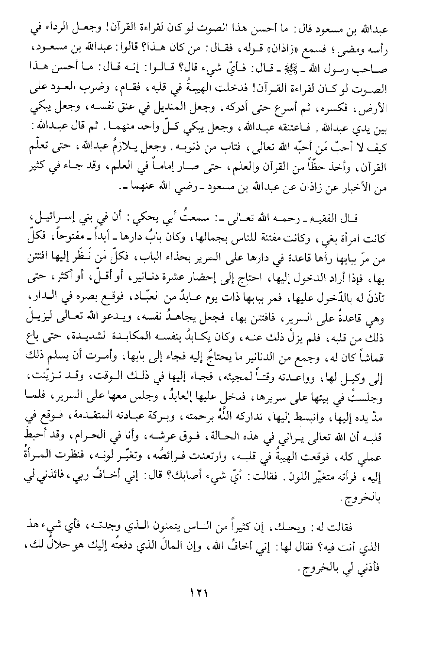 عَبْدُ اللَّهِ بْنُ مَسْعُودٍ قَالَ: مَا أَحْسَنَ هَذَا الصَّوْتَ لَوْ كَانَ لِقِرَاءَةِ كِتَابِ اللَّهِ تَعَالَى، وَجَعَلَ الرِّدَاءَ فِي رَأْسِهِ وَمَضَى.