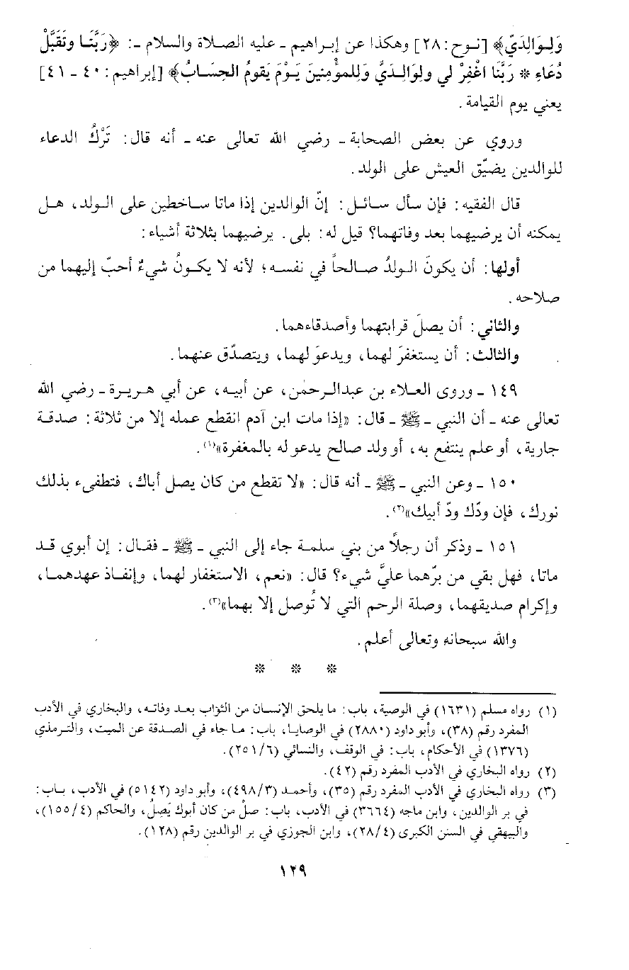 151 - وَذُكِرَ أَنَّ رَجُلًا مِنْ بَنِي سَلَمَةَ جَاءَ إِلَى النَّبِيِّ صَلَّى اللَّهُ عَلَيْهِ وَسَلَّمَ فَقَالَ: إِنَّ أَبَوَيَّ قَدْ مَاتَا فَهَلْ بَقِيَ مِنْ بِرِّهِمَا عَلَيَّ شَيْءٌ؟ قَالَ: نَعَمْ الِاسْتِغْفَارُ لَهُمَا وَإِنْفَاذُ عَهْدِهِمَا وَإِكْرَامُ صَدِيقِهِمَا وَصِلَةُ الرَّحِمِ الَّتِي لَا تُوصَلُ إِلَّا بِهِمَا وَاللَّهُ سُبْحَانَهُ وَتَعَالَى أَعْلَمُ