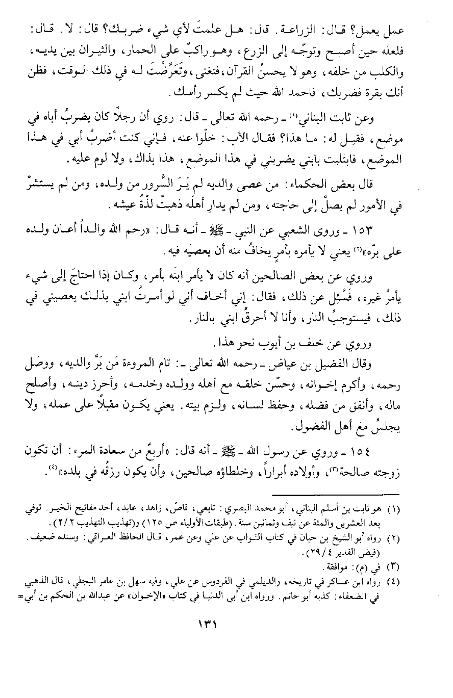 154 - وَرُوِيَ عَنْ رَسُولِ اللَّهِ صَلَّى اللَّهُ عَلَيْهِ وَسَلَّمَ , أَنَّهُ قَالَ: " أَرْبَعٌ مِنْ سَعَادَةِ الْمَرْءِ: أَنْ تَكُونَ زَوْجَتُهُ صَالِحَةً، وَأَوْلَادُهُ أَبْرَارًا، وَخُلَطَاؤُهُ صَالِحِينَ، وَأَنْ يَكُونَ رِزْقُهُ فِي بَلَدِهِ "
