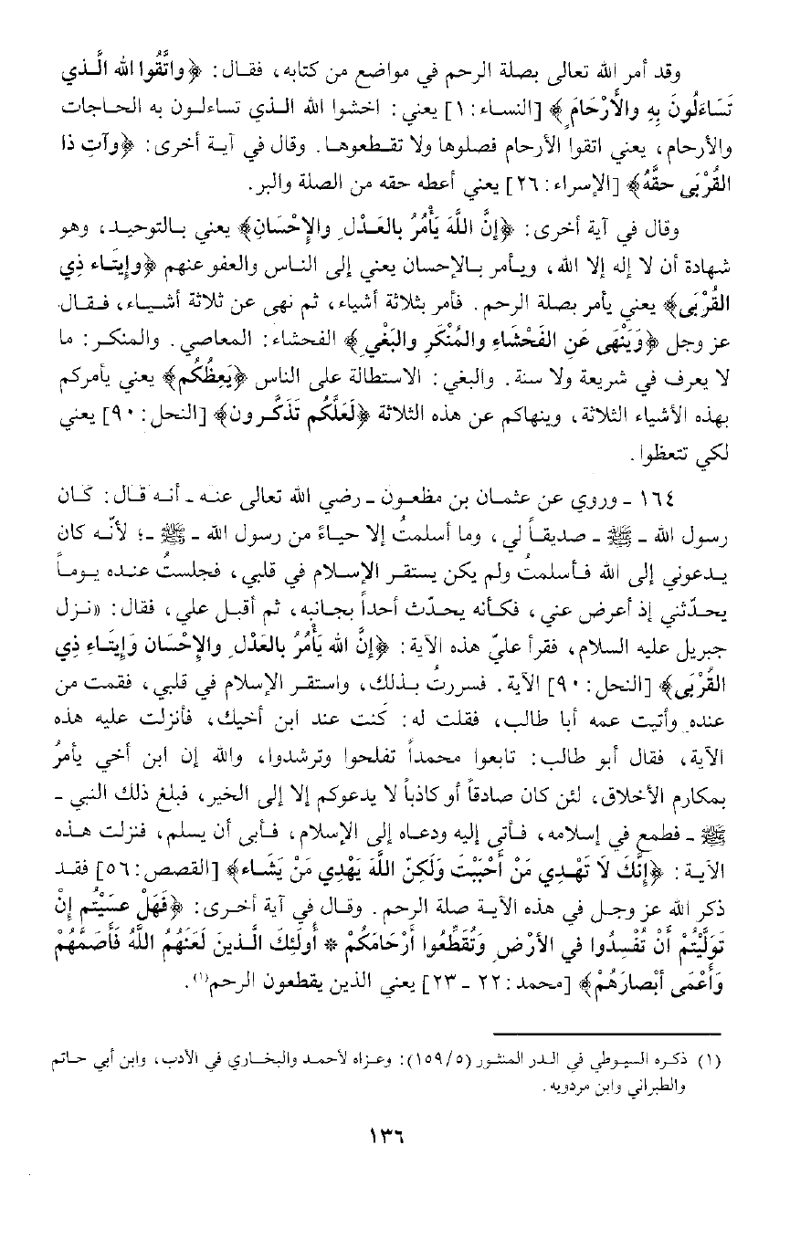 فَنَزَلَتْ هَذِهِ الْآيَةُ: {إِنَّكَ لا تَهْدِي مَنْ أَحْبَبْتَ وَلَكِنَّ اللَّهَ يَهْدِي مَنْ يَشَاءُ} [القصص: 56] ، فَقَدْ ذَكَرَ اللَّهُ عَزَّ وَجَلَّ فِي هَذِهِ الْآيَةِ صِلَةَ الرَّحِمِ.
