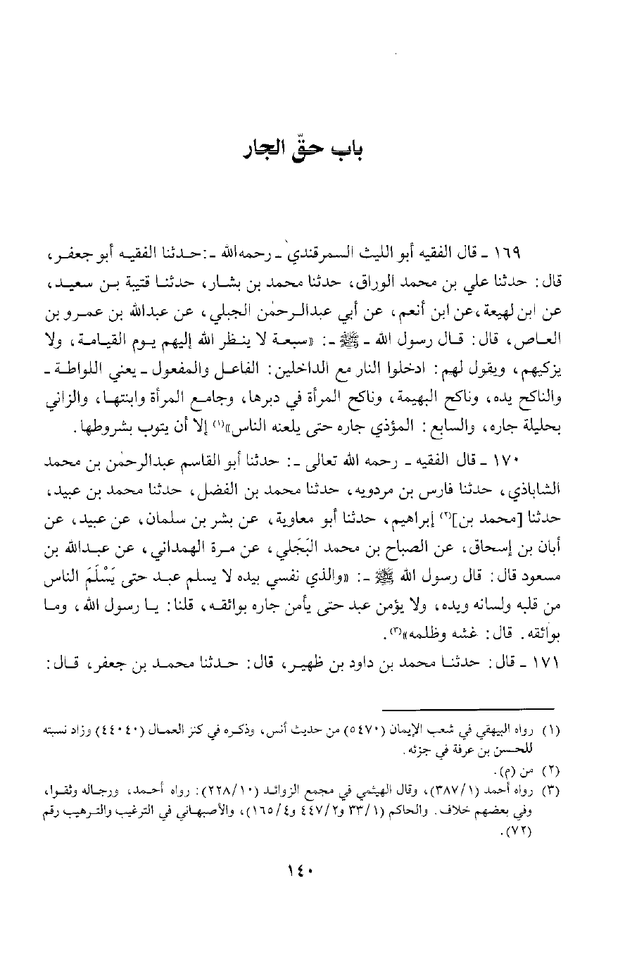 170 - حَدَّثَنَا أَبُو الْقَاسِمِ عَبْدُ الرَّحْمَنِ بْنُ مُحَمَّدٍ الشَّابَاذِيُّ، حَدَّثَنَا فَارِسٌ بْنُ مَرْدَوَيْهِ، حَدَّثَنَا مُحَمَّدٌ بْنُ الْفَضْلِ، حَدَّثَنَا مُحَمَّدٌ بْنُ عُبَيْدٍ، حَدَّثَنَا إِبْرَاهِيمُ، حَدَّثَنَا أَبُو مُعَاوِيَةَ، عَنْ بِشْرٍ بْنِ سَلْمَانَ , عَنْ عُبَيْدٍ , عَنْ أَبَانَ بْنِ إِسْحَاقَ , عَنْ الصَّبَّاحِ بْنِ مُحَمَّدٍ الْبَجَلِيُّ، عَنْ مُرَّةَ الْهَمْدَانِيِّ , عَنْ عَبْدِ اللَّهِ بْنِ مَسْعُودٍ , قَالَ: قَالَ رَسُولُ اللَّهِ صَلَّى اللَّهُ عَلَيْهِ وَسَلَّمَ: «وَالَّذِي نَفْسِي بِيَدِهِ، لَا يُسْلِمُ عَبْدٌ حَتَّى يَسْلَمَ النَّاسُ مِنْ قَلْبِهِ وَلِسَانِهِ وَيَدِهِ، وَلَا يُؤْمِنُ عَبْدٌ لَا يَأْمَنُ جَارُهُ بَوَائِقَهُ» .