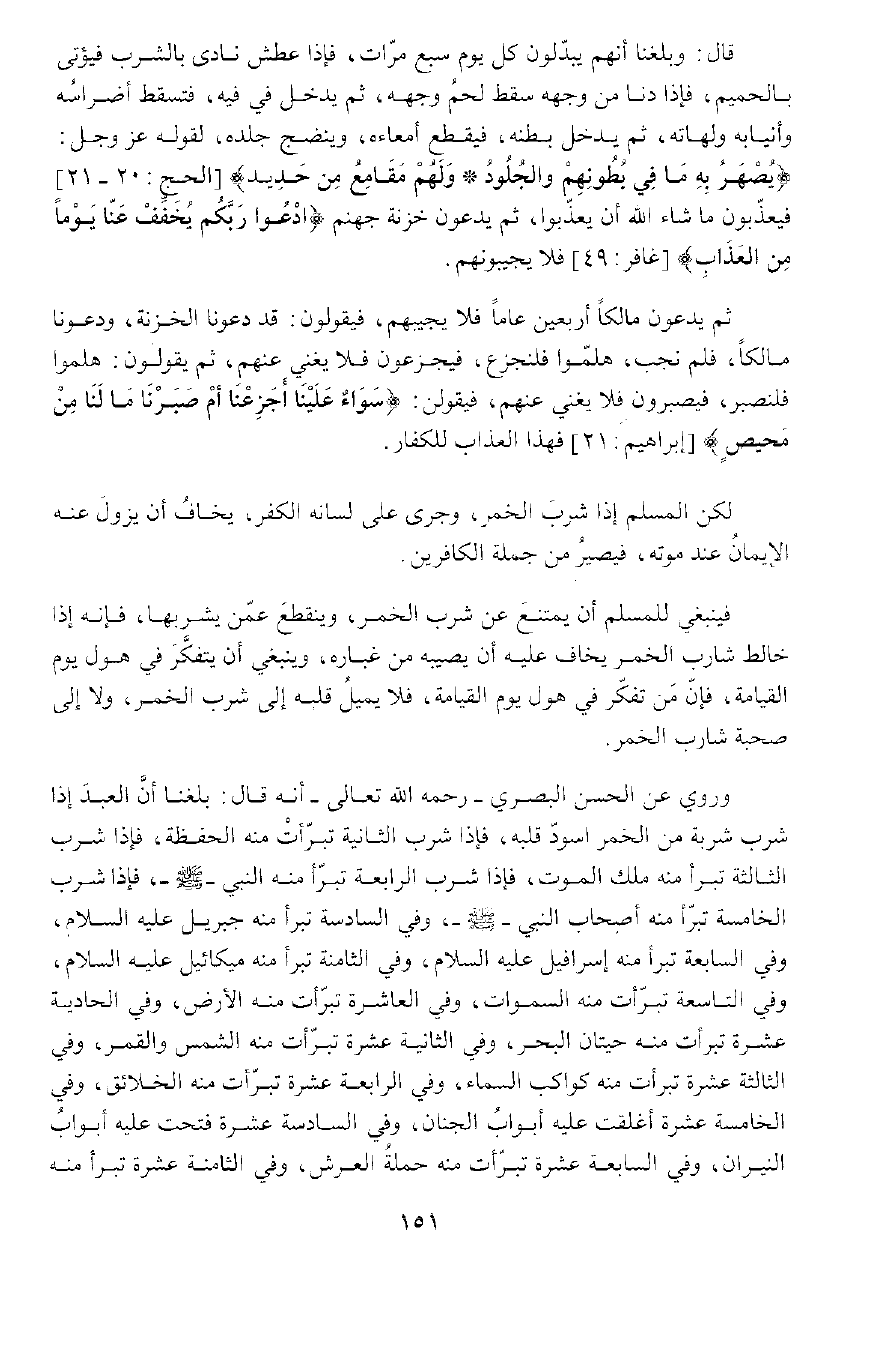 وَرُوِيَ عَنِ الْحَسَنِ الْبَصْرِيِّ رَحِمَهُ اللَّهُ تَعَالَى , أَنَّهُ قَالَ: بَلَغَنَا أَنَّ الْعَبْدِ إِذَا شَرِبَ شَرْبَةً مِنَ الْخَمْرِ اسْوَدَّ قَلْبُهُ.