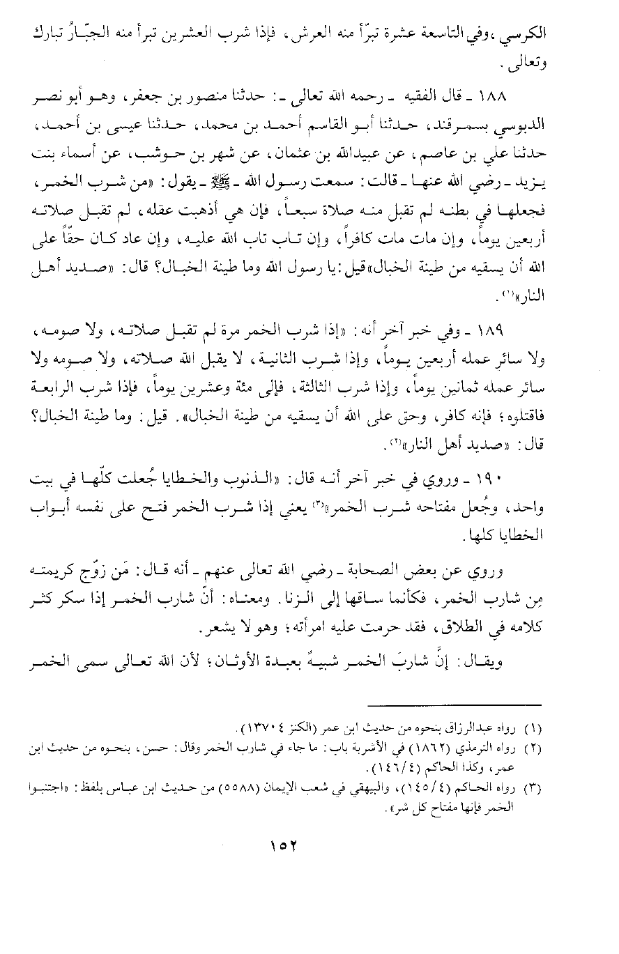 188 - حَدَّثَنَا مَنْصُورُ بْنُ جَعْفَرٍ وَهُوَ أَبُو نَصْرٍ الدَّبُّوسِيُّ , بِسَمَرْقَنْدَ، حَدَّثَنَا أَبُو الْقَاسِمِ أَحْمَدُ بْنُ مُحَمَّدٍ، حَدَّثَنَا عِيسَى بْنُ أَحْمَدَ، حَدَّثَنَا عَلِيٌّ بْنُ عَاصِمٍ , عَنْ عُبَيْدِ اللَّهِ بْنِ عُثْمَانَ , عَنْ شَهْرٍ بْنِ حَوْشَبَ، عَنْ أَسْمَاءَ بِنْتِ يَزِيدَ رَضِيَ اللَّهُ تَعَالَى عَنْهَا , قَالَتْ: سَمِعْتُ رَسُولَ اللَّهِ صَلَّى اللَّهُ عَلَيْهِ وَسَلَّمَ , يَقُولُ: «مَنْ شَرِبَ الْخَمْرَ فَجَعَلَهَا فِي بَطْنِهِ، لَمْ تُقْبَلْ مِنْهُ صَلَاتُهُ سَبْعًا، فَإِنْ هِيَ أَذْهَبَتْ عَقْلَهُ لَمْ تُقْبَلْ صَلَاتُهُ أَرْبَعِينَ يَوْمًا، وَإِنْ مَاتَ مَاتَ كَافِرًا وَإِنْ تَابَ تَابَ اللَّهُ عَلَيْهِ، وَإِنْ عَادَ كَانَ حَقًّا عَلَى اللَّهِ أَنْ يَسْقِيَهُ مِنْ طِينَةِ الْخَبَالِ» يَعْنِي مِنْ صَدِيدِ أَهْلِ النَّارِ،