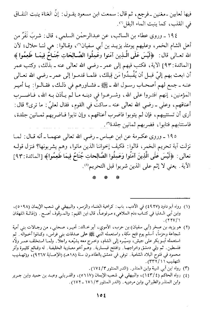 194 - وَرَوَى عَطَاءُ بْنُ السَّائِبِ , عَنْ عَبْدِ الرَّحْمَنِ السُّلَمِيِّ , قَالَ: شَرِبَ نَفَرٌ مِنْ أَهْلِ الشَّامِ الْخَمْرَ وَعَلَيْهِمْ يَوْمَئِذٍ مُعَاوِيَةُ بْنُ أَبِي سُفْيَانَ، وَقَالُوا هِيَ لَنَا حَلَالٌ لِأَنَّ اللَّهَ تَعَالَى قَالَ: {لَيْسَ عَلَى الَّذِينَ آمَنُوا وَعَمِلُوا الصَّالِحَاتِ جُنَاحٌ فِيمَا طَعِمُوا} [المائدة: 93] ، فَكَتَبَ فِيهِمْ إِلَى عُمَرَ رَضِيَ اللَّهُ تَعَالَى عَنْهُ بِذَلِكَ وَكَتَبَ عُمَرُ أَنِ ابْعَثْهُمْ إِلَيَّ قَبْلَ أَنْ يَفْسُدُوا مِنْ قِبَلِكَ.