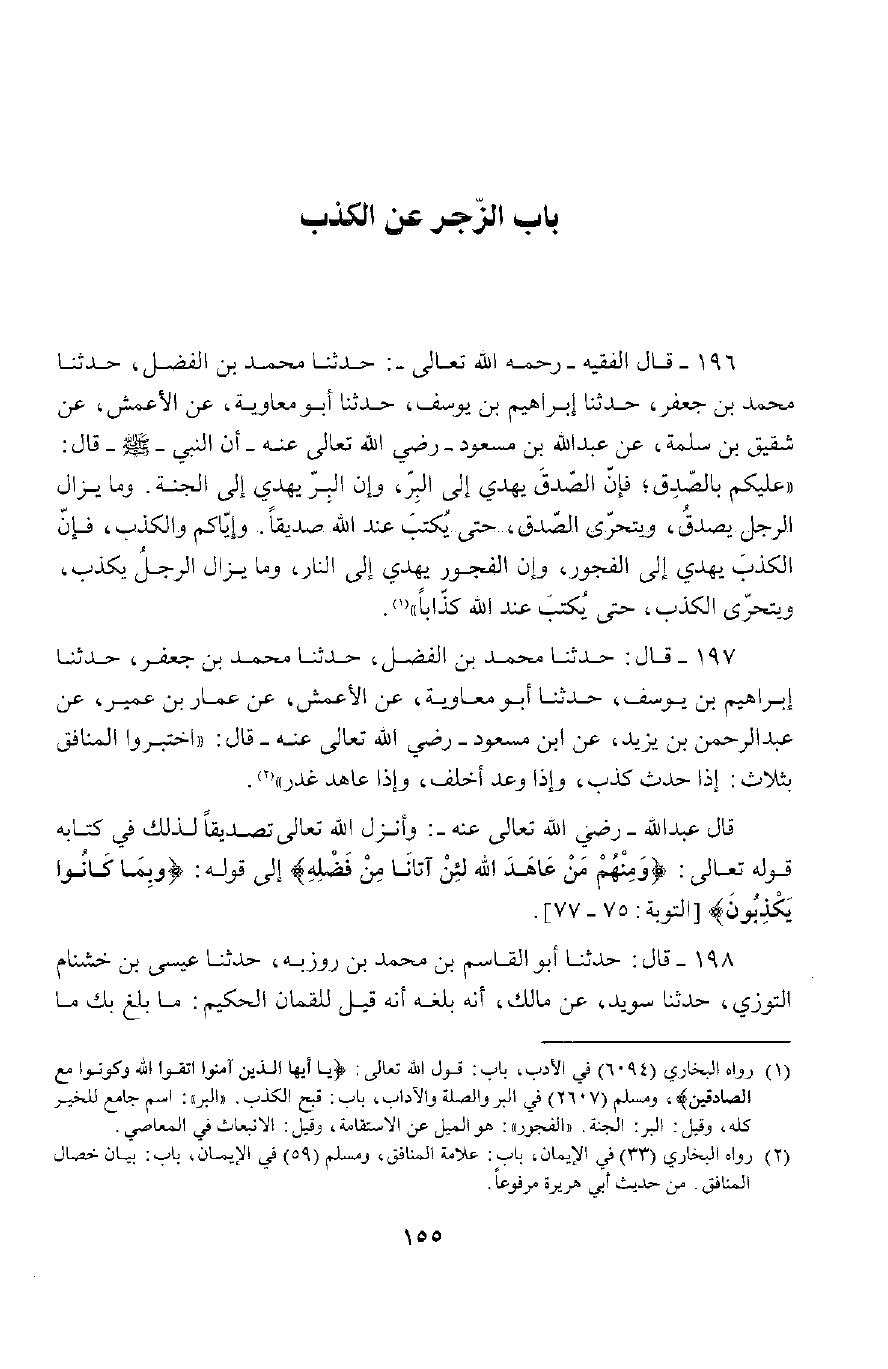 196 - حَدَّثَنَا مُحَمَّدٌ بْنُ الْفَضْلِ، حَدَّثَنَا مُحَمَّدٌ بْنُ جَعْفَرٍ، حَدَّثَنَا إِبْرَاهِيمُ بْنُ يُوسُفَ، حَدَّثَنَا أَبُو مُعَاوِيَةَ، عَنِ الْأَعْمَشِ , عَنْ شَقِيقٍ بْنِ سَلَمَةَ , عَنْ عَبْدِ اللَّهِ بْنِ مَسْعُودٍ رَضِيَ اللَّهُ تَعَالَى عَنْهُ , أَنَّ النَّبِيَّ صَلَّى اللَّهُ عَلَيْهِ وَسَلَّمَ قَالَ: «عَلَيْكُمْ بِالصِّدْقِ فَإِنَّ الصِّدْقَ يَهْدِي إِلَى الْبِرِّ، وَإِنَّ الْبِرَّ يَهْدِي إِلَى الْجَنَّةِ، وَمَا يَزَالُ الرَّجُلُ يَصْدُقُ وَيَتَحَرَّى الصِّدْقَ حَتَّى يُكْتَبَ عِنْدَ اللَّهِ صِدِّيقًا، وَإِيَّاكُمْ وَالْكَذِبَ، فَإِنَّ الْكَذِبَ يَهْدِي إِلَى الْفُجُورِ، وَإِنَّ الْفُجُورَ يَهْدِي إِلَى النَّارِ، وَمَا يَزَالُ الرَّجُلُ يَكْذِبُ وَيَتَحَرَّى الْكَذِبَ حَتَّى يُكْتَبَ عِنْدَ اللَّهِ كَذَّابًا»