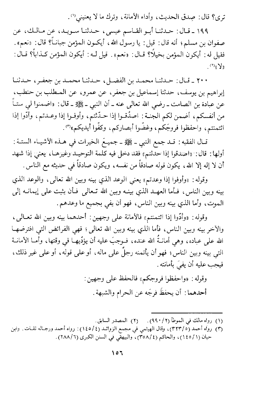 200 - قَالَ: حَدَّثَنَا مُحَمَّدٌ بْنُ الْفَضْلِ، حَدَّثَنَا مُحَمَّدٌ بْنُ جَعْفَرٍ، حَدَّثَنَا إِبْرَاهِيمُ بْنُ يُوسُفَ، حَدَّثَنَا إِسْمَاعِيلُ بْنُ جَعْفَرٍ , عَنْ عُمَرَ عَنِ الْمُطَّلِبِ بْنِ حَنْطَبٍ، عَنْ عُبَادَةَ بْنِ الصَّامِتِ رَضِيَ اللَّهُ تَعَالَى عَنْهُ , أَنَّ النَّبِيَّ صَلَّى اللَّهُ عَلَيْهِ وَسَلَّمَ , قَالَ: " اضْمَنُوا سِتًّا مِنْ أَنْفُسِكُمْ أَضْمَنُ لَكُمُ الْجَنَّةَ: اصْدُقُوا إِذَا حَدَّثْتُمْ، وَأَوْفُوا إِذَا وَعَدْتُمْ، وَأَدُّوا إِذَا ائْتُمِنْتُمْ، وَاحْفَظُوا فُرُوجَكُمْ وَغُضُّوا أَبْصَارَكُمْ وَكُفُّوا أَيْدِيَكُمْ "