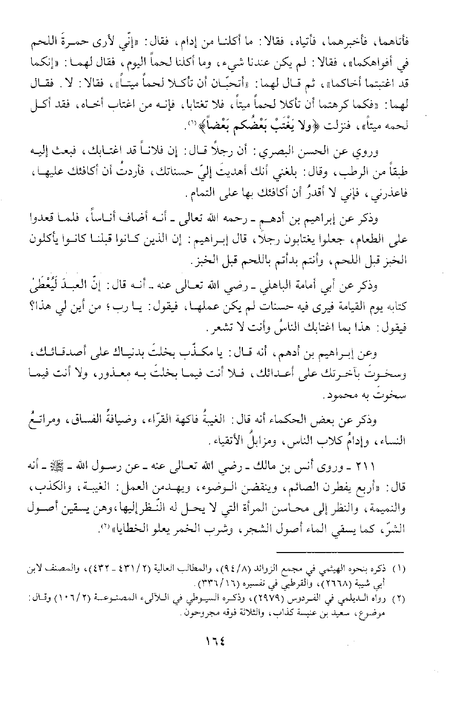 قَالَ إِبْرَاهِيمُ: إِنَّ الَّذِينَ كَانُوا قَبْلَنَا كَانُوا يَأْكُلُونَ الْخُبْزَ قَبْلَ اللَّحْمِ، وَأَنْتُمْ بَدَأْتُمْ قَبْلَ الْخُبْزِ وَذُكِرَ عَنْ أَبِي أُمَامَةَ الْبَاهِلِيِّ رَضِيَ اللَّهُ تَعَالَى عَنْهُ , أَنَّهُ قَالَ: إِنَّ الْعَبْدَ لَيُعْطَى كِتَابَهُ يَوْمَ الْقِيَامَةِ فَيَرَى فِيهِ حَسَنَاتٍ لَمْ يَكُنْ عَمِلَهَا، فَيَقُولُ يَا رَبُّ مِنْ أَيْنَ لِي هَذَا؟ فَيَقُولُ هَذَا بِمَا اغْتَابَكَ النَّاسُ وَأَنْتَ لَا تَشْعُرُ وَذُكِرَ عَنْ إِبْرَاهِيمَ بْنِ أَدْهَمَ , أَنَّهُ قَالَ: يَا مُكَذِّبُ بَخِلْتَ بِدُنْيَاكَ عَلَى أَصْدِقَائِكَ وَسَخَوْتَ بِآخِرَتِكَ عَلَى أَعْدَائِكَ، فَلَا أَنْتَ فِيمَا بَخِلْتَ بِهِ مَعْذُورٌ، وَلَا أَنْتَ فِيمَا سَخَوْتَ بِهِ مَحْمُودٌ وَذُكِرَ عَنْ بَعْضِ الْحُكَمَاءِ أَنَّهُ قَالَ: الْغِيبَةُ فَاكِهَةُ الْقُرَّاءِ، وَضِيَافَةُ الْفُسَّاقِ، وَمَرَاتِعُ النِّسَاءِ، وَأُدَامُ كِلَابِ النَّاسِ، وَمَزَابِلُ الْأَتْقِيَاءِ.
