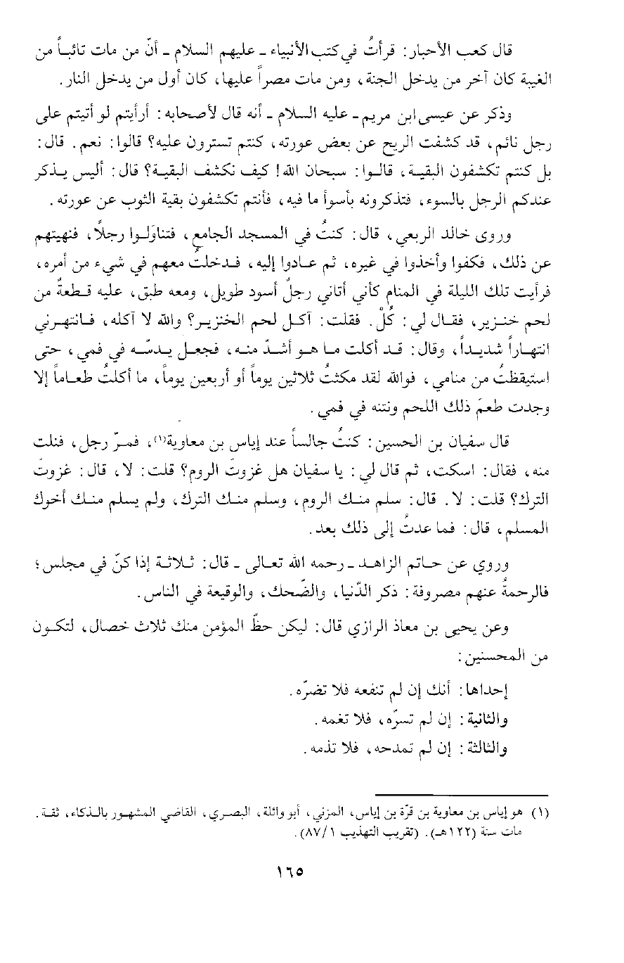 وَعَنْ يَحْيَى بْنِ مُعَاذٍ الرَّازِيِّ قَالَ: لِيَكُنْ حَظُّ الْمُؤْمِنِ مِنْكَ ثَلَاثُ خِصَالٍ لِتَكُونَ مِنَ الْمُحْسِنِينَ: أَحَدُهَا أَنَّكَ إِنْ لَمْ تَنْفَعْهُ فَلَا تَضُرُّهُ.
