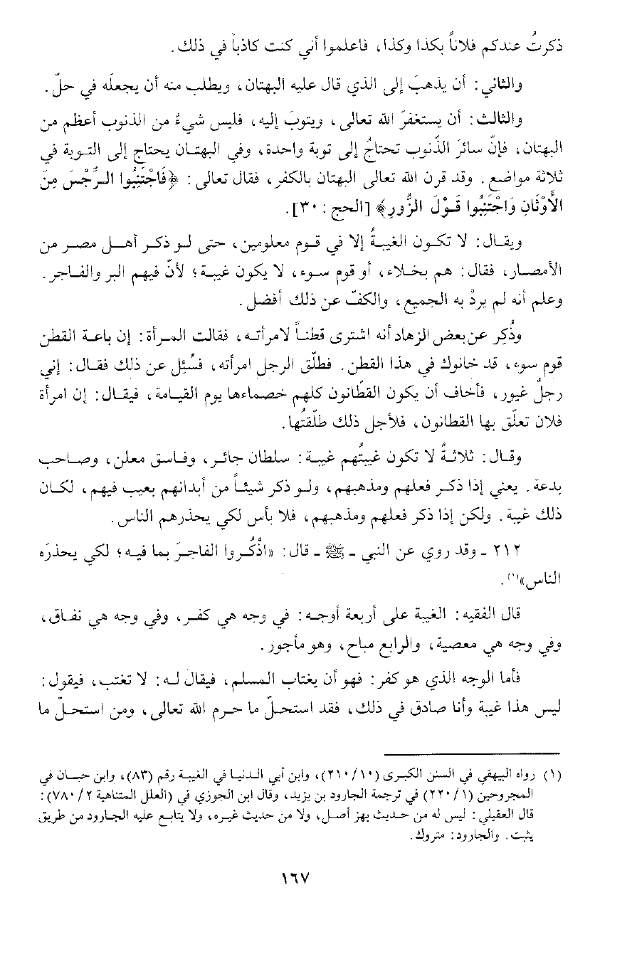 212 - وَرُوِيَ عَنِ النَّبِيِّ صَلَّى اللَّهُ عَلَيْهِ وَسَلَّمَ أَنَّهُ قَالَ: «اذْكُرُوا الْفَاجِرَ بِمَا فِيهِ لِكَيْ يَحْذَرَهُ النَّاسُ» قَالَ رَضِيَ اللَّهُ تَعَالَى عَنْهُ: الْغِيبَةُ عَلَى أَرْبَعَةِ أَوْجُهٍ: فِي وَجْهٍ هِيَ كُفْرٌ، وَفِي وَجْهٍ هِيَ نِفَاقٌ، وَفِي وَجْهٍ هِيَ مَعْصِيَةٌ، وَالرَّابِعُ مُبَاحٌ وَهُوَ مَأْجُورٌ، فَأَمَّا الْوَجْهُ الَّذِي هُوَ كُفْرٌ فَهُوَ أَنْ يَغْتَابَ الْمُسْلِمَ، فَيُقَالُ لَهُ لَا تَغْتَبْ فَيَقُولُ لَيْسَ هَذَا غَيْبَةٌ وَأَنَا صَادِقٌ فِي ذَلِكَ.