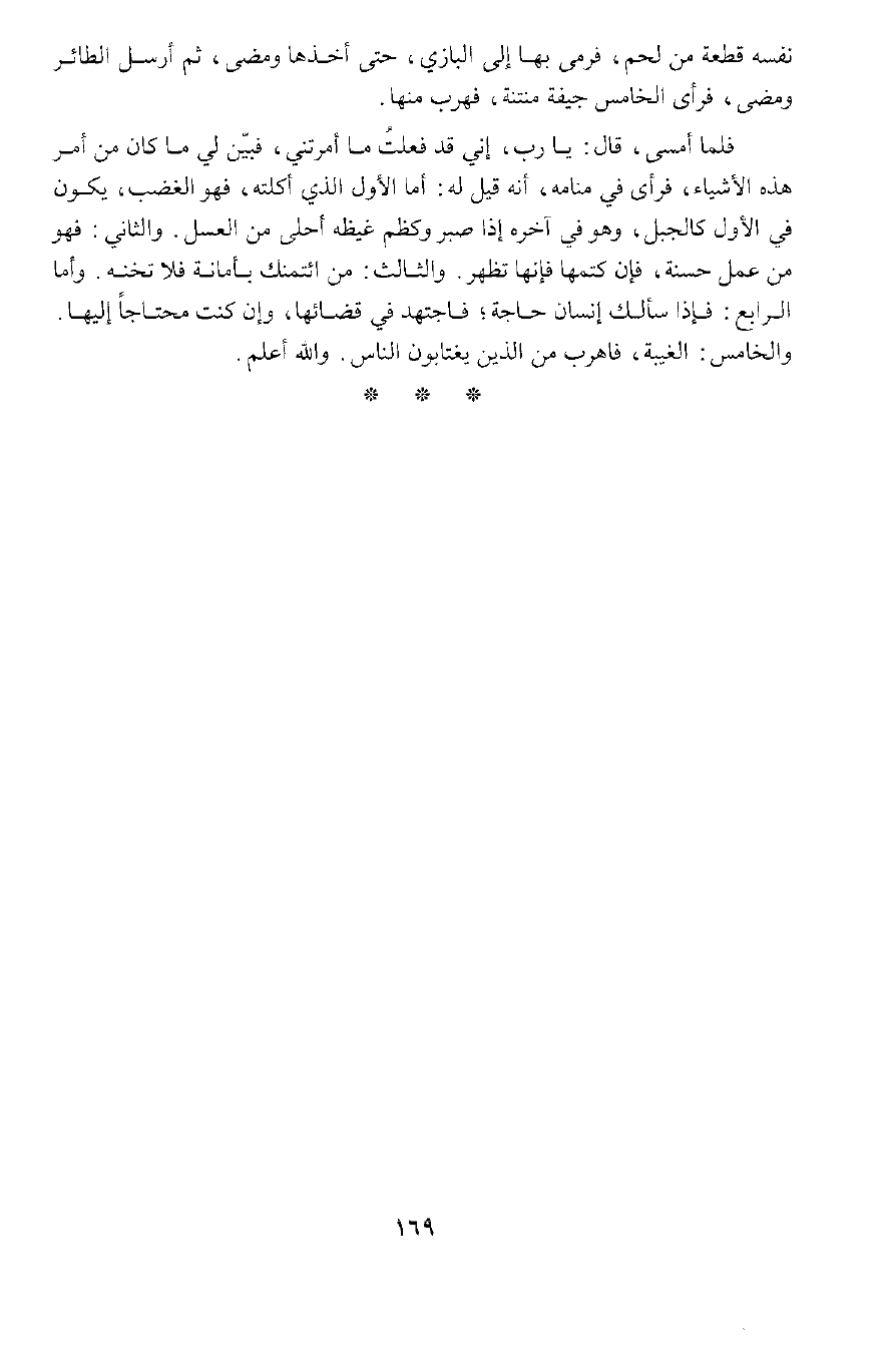 فَرَأَى الْخَامِسَ جِيفَةً مُنْتِنَةً، فَهَرَبَ فَلَمَّا أَمْسَى قَالَ: يَا رَبُّ إِنِّي قَدْ فَعَلْتُ مَا أَمَرْتَنِي فَبَيِّنْ لِي مَا كَانَ مِنْ أَمْرِ هَذِهِ الْأَشْيَاءَ.