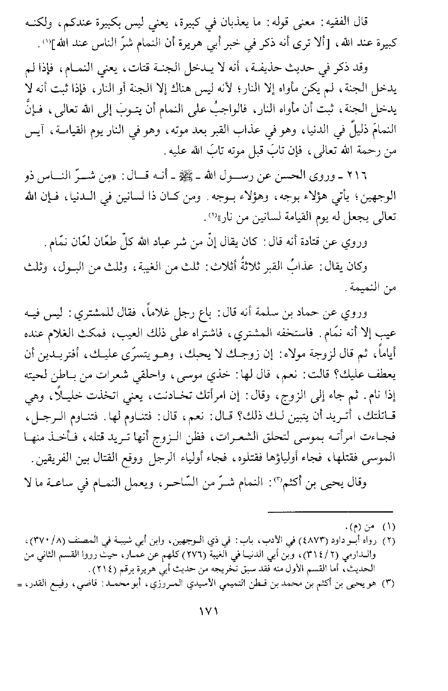 216 - وَرُوِيَ عَنْ قَتَادَةَ , أَنَّهُ قَالَ: كَانَ يُقَالُ: مِنْ شَرِّ عِبَادِ اللَّهِ كُلُّ طَعَّانٍ، لَعَّانٍ، نَمَّامٍ.