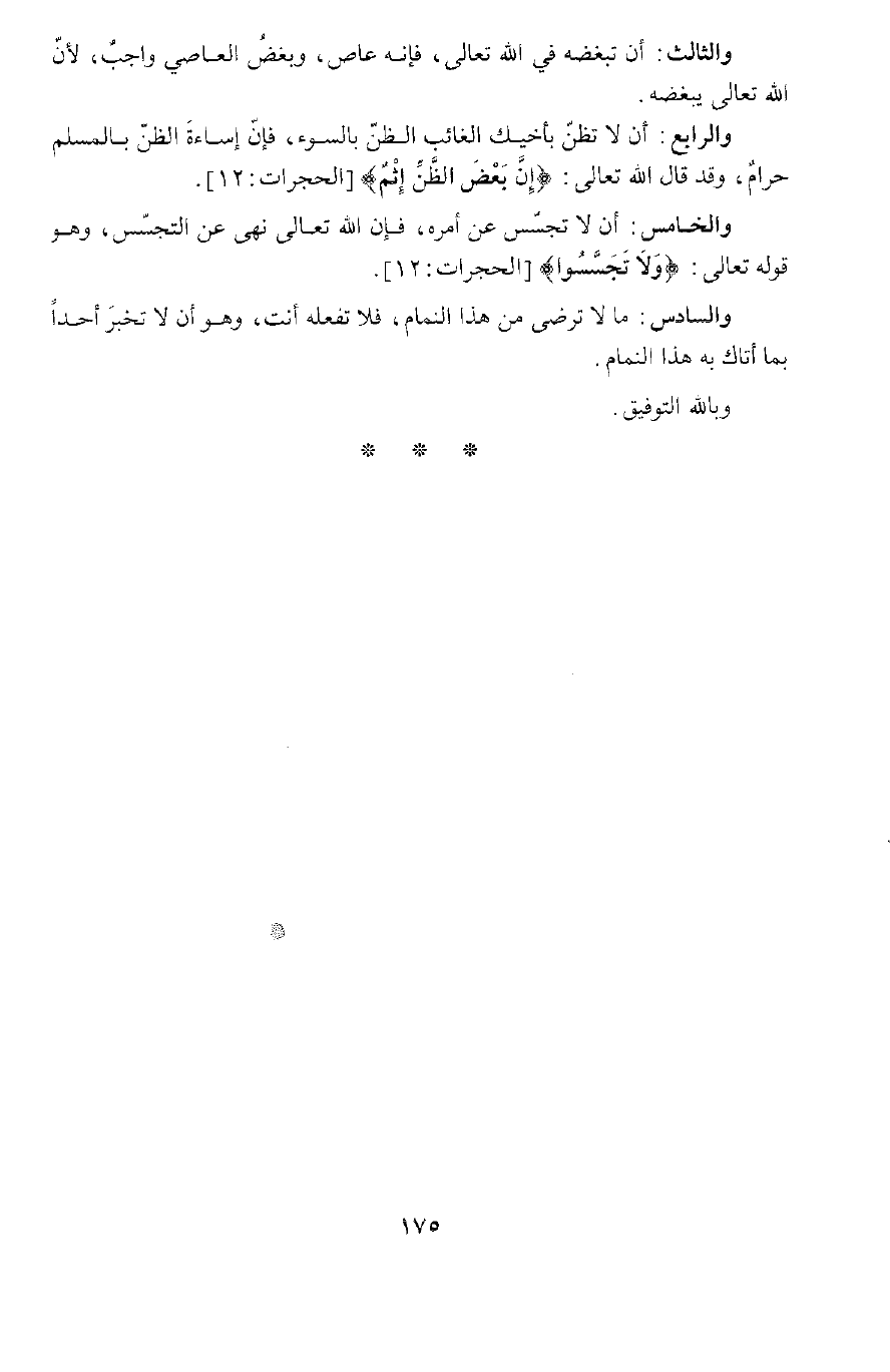 وَقَدْ قَالَ اللَّهُ تَعَالَى: {إِنَّ بَعْضَ الظَّنِّ إِثْمٌ} [الحجرات: 12] ، وَالْخَامِسُ: أَنْ لَا تَجَسُّسَ عَنْ أَمْرِهِ، فَإِنَّ اللَّهَ تَعَالَى نَهَى عَنِ التَّجَسُّسِ.
