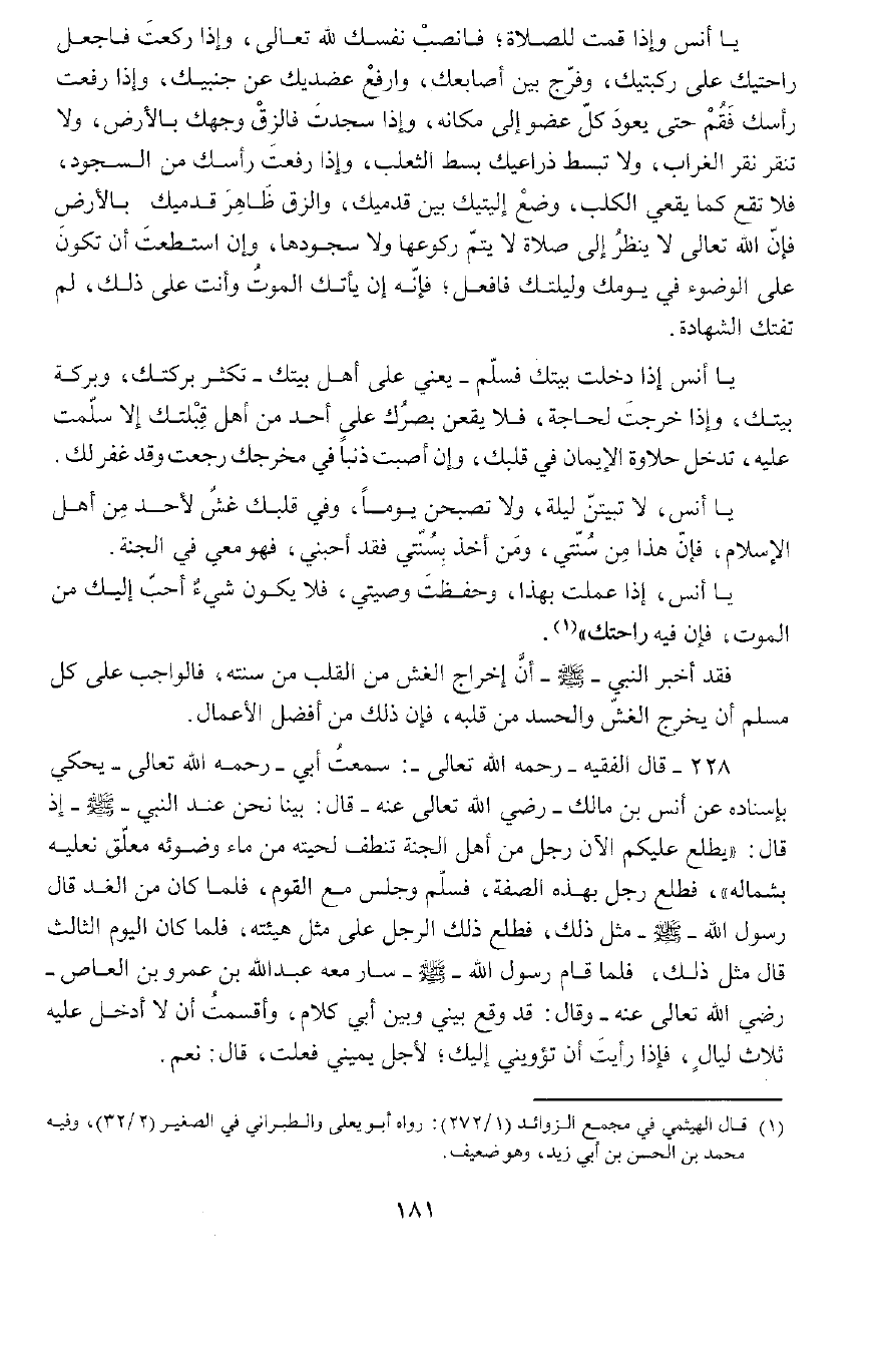 يَا أَنَسُ، وَإِذَا قُمْتَ لِلصَّلَاةِ فَانْصِبْ نَفْسَكَ للَّهِ تَعَالَى، وَإِذَا رَكَعْتَ فَاجْعَلْ رَاحَتَيْكَ عَلَى رُكْبَتَيْكَ، وَفَرِّجْ بَيْنَ أَصَابِعِكَ، وَارْفَعْ عَضُدَيْكَ عَنْ جَنْبَيْكَ، وَإِذَا رَفَعْتَ رَأْسَكَ فَقُمْ حَتَّى يَعُودَ كُلُّ عُضْوٍ إِلَى مَكَانِهِ، وَإِذَا سَجَدْتَ فَأَلْقِ وَجْهَكَ بِالْأَرْضِ وَلَا تَنْقُرْ نَقْرَ الْغُرَابِ، وَلَا تَبْسُطْ ذِرَاعَيْكَ بَسْطَ الثَّعْلَبِ، وَإِذَا رَفَعْتَ رَأْسَكَ مِنَ السُّجُودِ فَلَا تُقْعِ كَمَا يُقْعِي الْكَلْبُ، وَضَعْ إِلْيَتَكَ بَيْنَ قَدَمَيْكَ، وَالْزَقْ ظَاهِرَ قَدَمَيْكَ بِالْأَرْضِ، فَإِنَّ اللَّهَ تَعَالَى لَا يَنْظُرُ إِلَى صَلَاةٍ لَا يَتِمُّ رُكُوعُهَا وَلَا سُجُودُهَا، وَإِنِ اسْتَطَعْتَ أَنْ تَكُونَ عَلَى الْوُضُوءِ فِي يَوْمِكَ وَلَيْلَتِكَ فَافْعَلْ، فَإِنَّهُ إِنْ يَأْتِكَ الْمَوْتُ وَأَنْتَ عَلَى ذَلِكَ لَمْ تَفُتْكَ الشَّهَادَةُ.