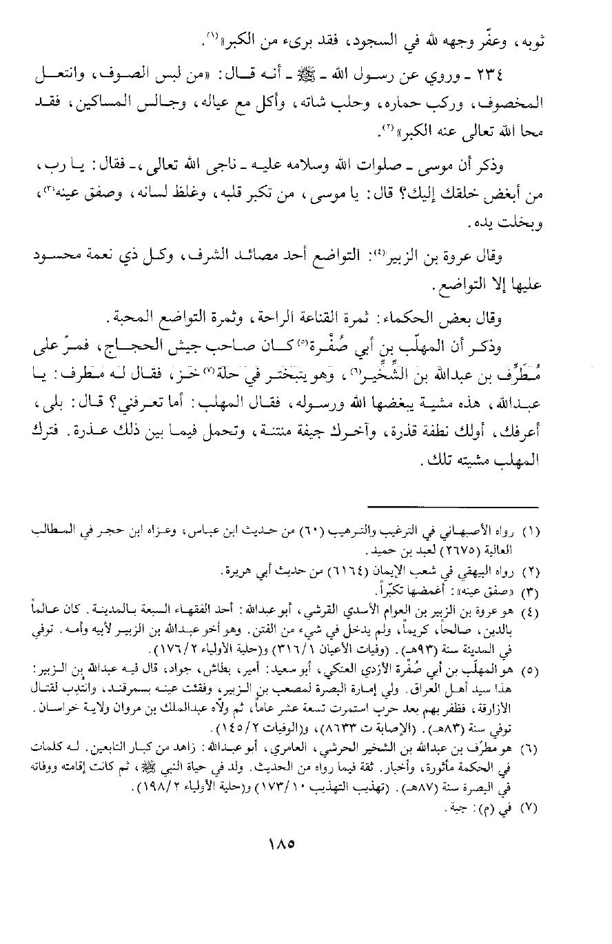 وَذُكِرَ أَنَّ الْمُهَلَّبَ بْنَ أَبِي صُفْرَةَ كَانَ صَاحِبَ جَيْشِ الْحَجَّاجِ، فَمَرَّ عَلَى مُطَرِّفِ بْنِ عَبْدِ اللَّهِ بْنِ الشِّخِّيرِ، وَهُوَ يَتَبَخْتَرُ فِي حُلَّةِ خَزٍّ، فَقَالَ لَهُ مُطَرِّفٌ: يَا عَبْدَ اللَّهِ هَذِهِ مِشْيَةٌ يُبْغِضُهَا اللَّهُ وَرَسُولُهُ.