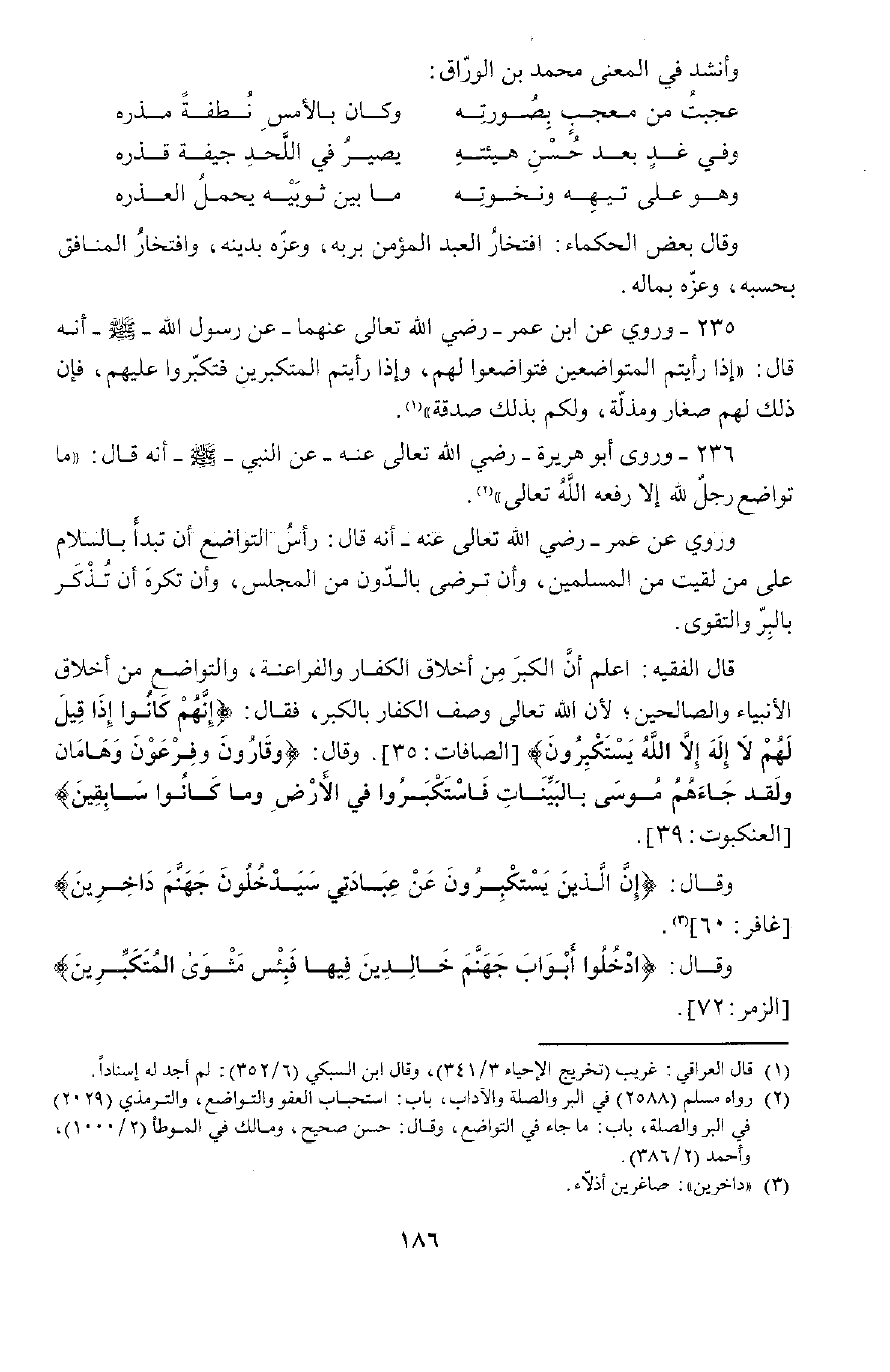 236 - وَروَى أَبُو هُرَيْرَةَ رَضِيَ اللَّهُ تَعَالَى عَنْهُ، عَنِ النَّبِيِّ صَلَّى اللَّهُ عَلَيْهِ وَسَلَّمَ , أَنَّهُ قَالَ: «مَا تَوَاضَعَ رَجُلٌ للَّهِ إِلَّا رَفَعَهُ اللَّهُ تَعَالَى» وَرَوَى عَنْ عُمَرَ رَضِيَ اللَّهُ عَنْهُ , أَنَّهُ قَالَ: «رَأْسُ التَّوَاضُعِ أَنْ تَبْدَأَ بِالسَّلَامِ عَلَى مَنْ لَقِيتَ مِنَ الْمُسْلِمِينَ، وَأَنْ تَرْضَى بِالدُّونِ مِنَ الْمَجْلِسِ، وَأَنْ تَكْرَهَ أَنْ تُذَكِّرَ بِالْبِرِّ وَالتَّقْوَى» اعْلَمْ أَنَّ الْكِبْرَ مِنْ أَخْلَاقِ الْكُفَّارِ وَالْفَرَاعِنَةِ، وَالتَّوَاضُعُ مِنْ أَخْلَاقِ الْأَنْبِيَاءِ وَالصَّالِحِينَ، لِأَنَّ اللَّهَ تَعَالَى وَصَفَ الْكُفَّارَ بِالْكِبْرِ فَقَالَ: {إِنَّهُمْ كَانُوا إِذَا قِيلَ لَهُمْ لا إِلَهَ إِلا اللَّهُ يَسْتَكْبِرُونَ} [الصافات: 35] ، وَقَالَ: {وَقَارُونَ وَفِرْعَوْنَ وَهَامَانَ وَلَقَدْ جَاءَهُمْ مُوسَى بِالْبَيِّنَاتِ فَاسْتَكْبَرُوا فِي الأَرْضِ وَمَا كَانُوا سَابِقِينَ} [العنكبوت: 39] ، وَقَالَ: {إِنَّ الَّذِينَ يَسْتَكْبِرُونَ عَنْ عِبَادَتِي سَيَدْخُلُونَ جَهَنَّمَ دَاخِرِينَ} [غافر: 60] ، وَقَالَ: {ادْخُلُوا أَبْوَابَ جَهَنَّمَ خَالِدِينَ فِيهَا فَبِئْسَ مَثْوَى الْمُتَكَبِّرِينَ} [الزمر: 72]