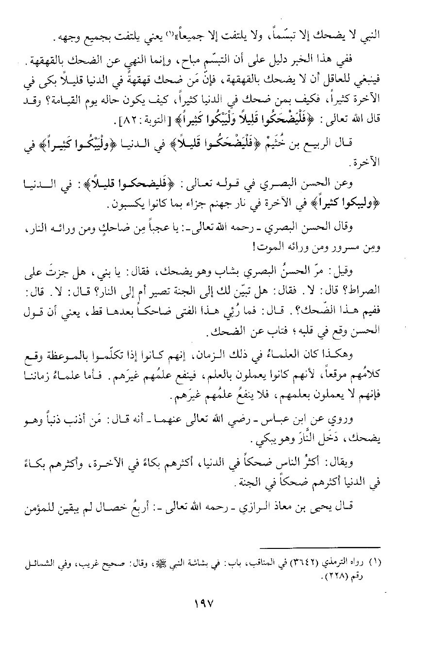 وَعَنِ الْحَسَنِ الْبَصْرِيِّ فِي قَوْلِهِ تَعَالَى: {فَلْيَضْحَكُوا قَلِيلا} [التوبة: 82] فِي الدُّنْيَا {وَلْيَبْكُوا كَثِيرًا} [التوبة: 82] فِي الْآخِرَةِ.