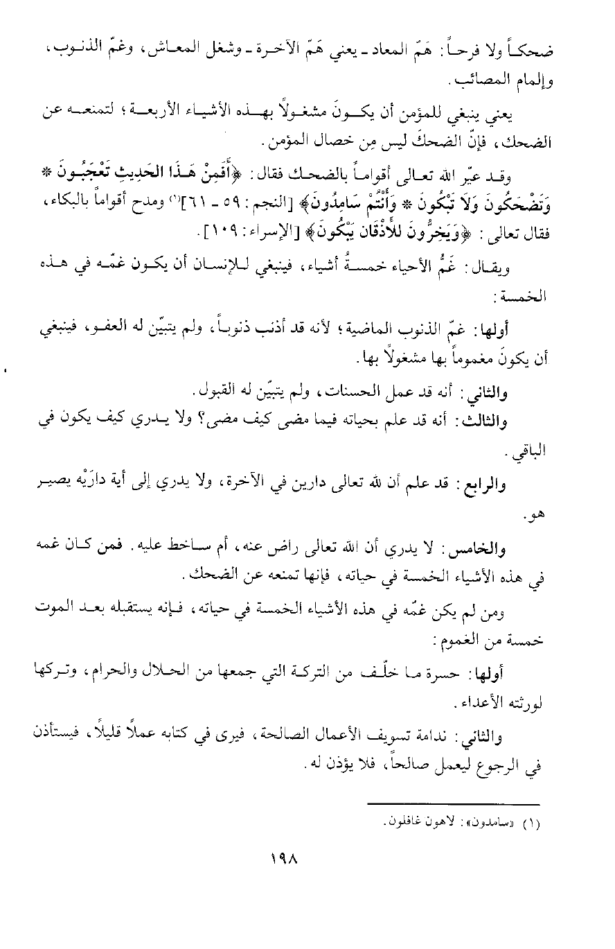 يَعْنِي يَنْبَغِي لِلْمُؤْمِنِ أَنْ يَكُونَ مَشْغُولًا بِهَذِهِ الْأَشْيَاءِ الْأَرْبَعَةِ، لِتَمْنَعَهُ عَنِ الضَّحِكِ، فَإِنَّ الضَّحِكَ لَيْسَ مِنْ خِصَالِ الْمُؤْمِنِ.