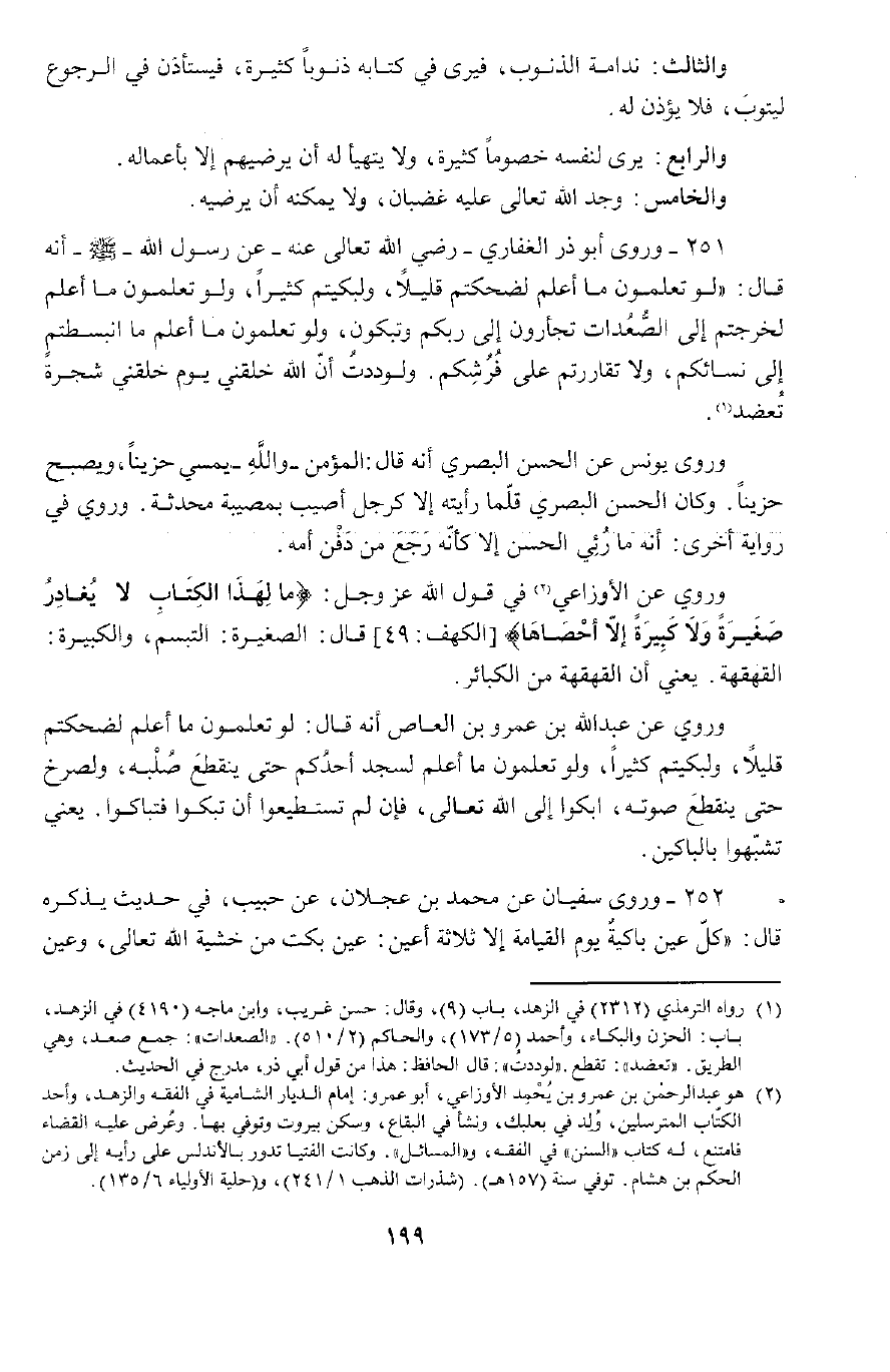 251 - وَرَوَى أَبُو ذَرٍّ الْغِفَارِيُّ رَضِيَ اللَّهُ تَعَالَى عَنْهُ، عَنْ رَسُولِ اللَّهِ صَلَّى اللَّهُ عَلَيْهِ وَسَلَّمَ , أَنَّهُ قَالَ: «لَوْ تَعْلَمُونَ مَا أَعْلَمُ لَضَحِكْتُمْ قَلِيلًا وَلَبَكَيْتُمْ كَثِيرًا، وَلَوْ تَعْلَمُونَ مَا أَعْلَمُ لَخَرَجْتُمْ إِلَى الصُّعُدَاتِ تَجْأَرُونَ إِلَى رَبِّكُمْ وَتَبْكُونَ، وَلَوْ تَعْلَمُونَ مَا أَعْلَمُ مَا انْبَسَطْتُمْ إِلَى نِسَائِكُمْ وَلَا تَقَارَرْتُمْ عَلَى فُرُشِكُمْ.