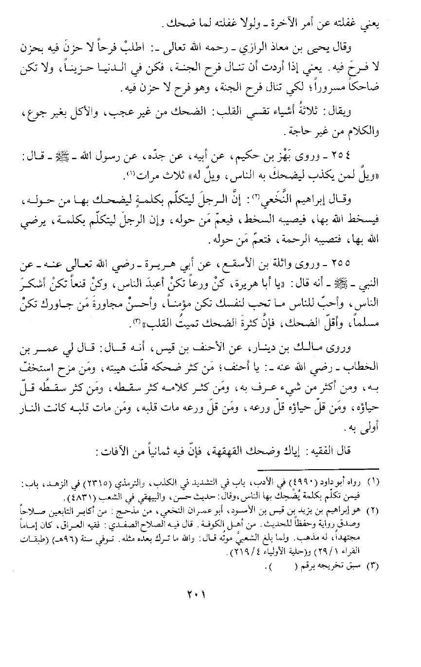 وَرَوَى مَالِكُ بْنُ دِينَارٍ، عَنِ الْأَحْنَفِ بْنِ قَيْسٍ , أَنَّهُ قَالَ: قَالَ لِيَ عُمَرُ بْنُ الْخَطَّابِ رَضِيَ اللَّهُ تَعَالَى عَنْهُ: " مَنْ كَثُرَ ضَحِكُهُ قَلَّتْ هَيْبَتُهُ، وَمَنْ مَزَحَ اسْتُخِفَّ بِهِ، وَمَنْ أَكْثَرَ مِنْ شَيْءٍ عُرِفَ بِهِ، وَمَنْ كَثُرَ كَلَامُهُ كَثُرَ سَقَطُهُ، وَمَنْ كَثُرَ سَقَطُهُ قَلَّ حَيَاؤُهُ، وَمَنْ قَلَّ حَيَاؤُهُ قَلَّ وَرَعُهُ، وَمَنْ قَلَّ وَرَعُهُ مَاتَ قَلْبُهُ، وَمَنْ مَاتَ قَلْبُهُ كَانَتِ النَّارُ أَوْلَى بِهِ.
